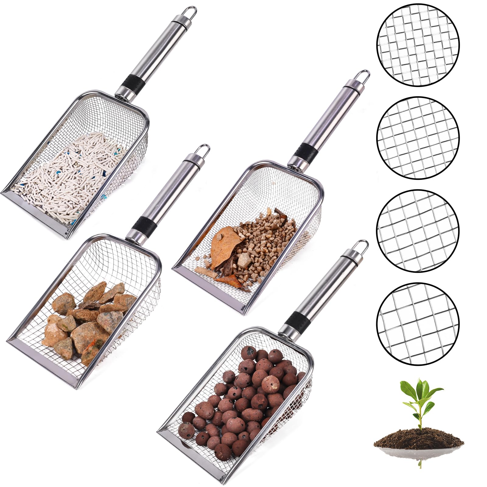 4 piezas de tamiz de tierra de jardinería (malla de 0.7/1.1/1.5/2 pulgadas) con mango – arena, rocas, suciedad, grava, abono para