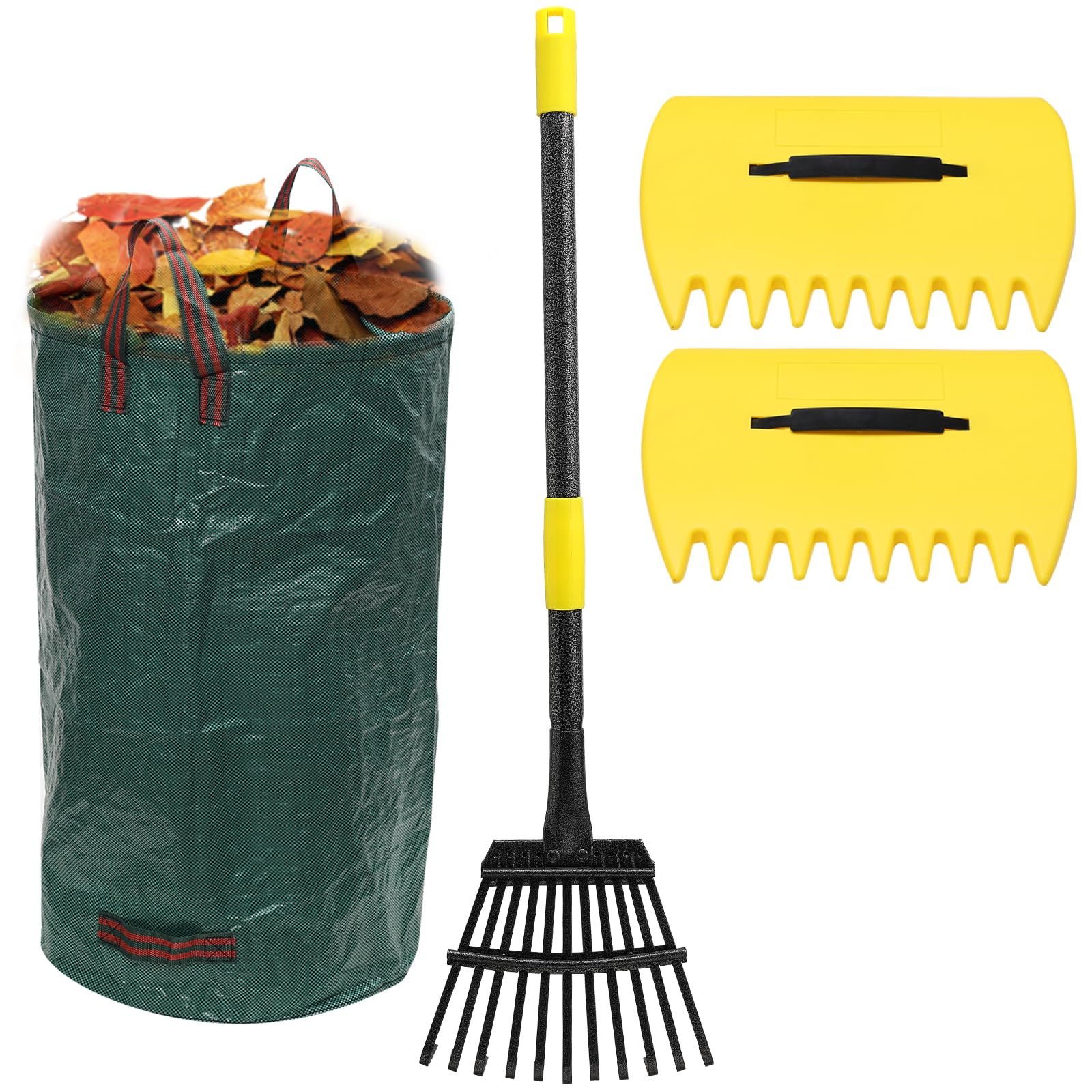 Rastrillo de metal para hojas de jardín con bolsas de 32 galones para césped y hojas y cucharas de hojas, 11 dientes ajustables de