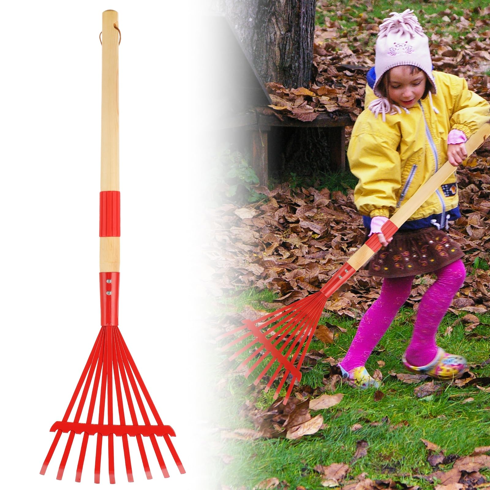 Rastrillos para niños con mango de madera dura, rastrillos de metal con hojas para niños, rastrillos de césped de tamaño infantil