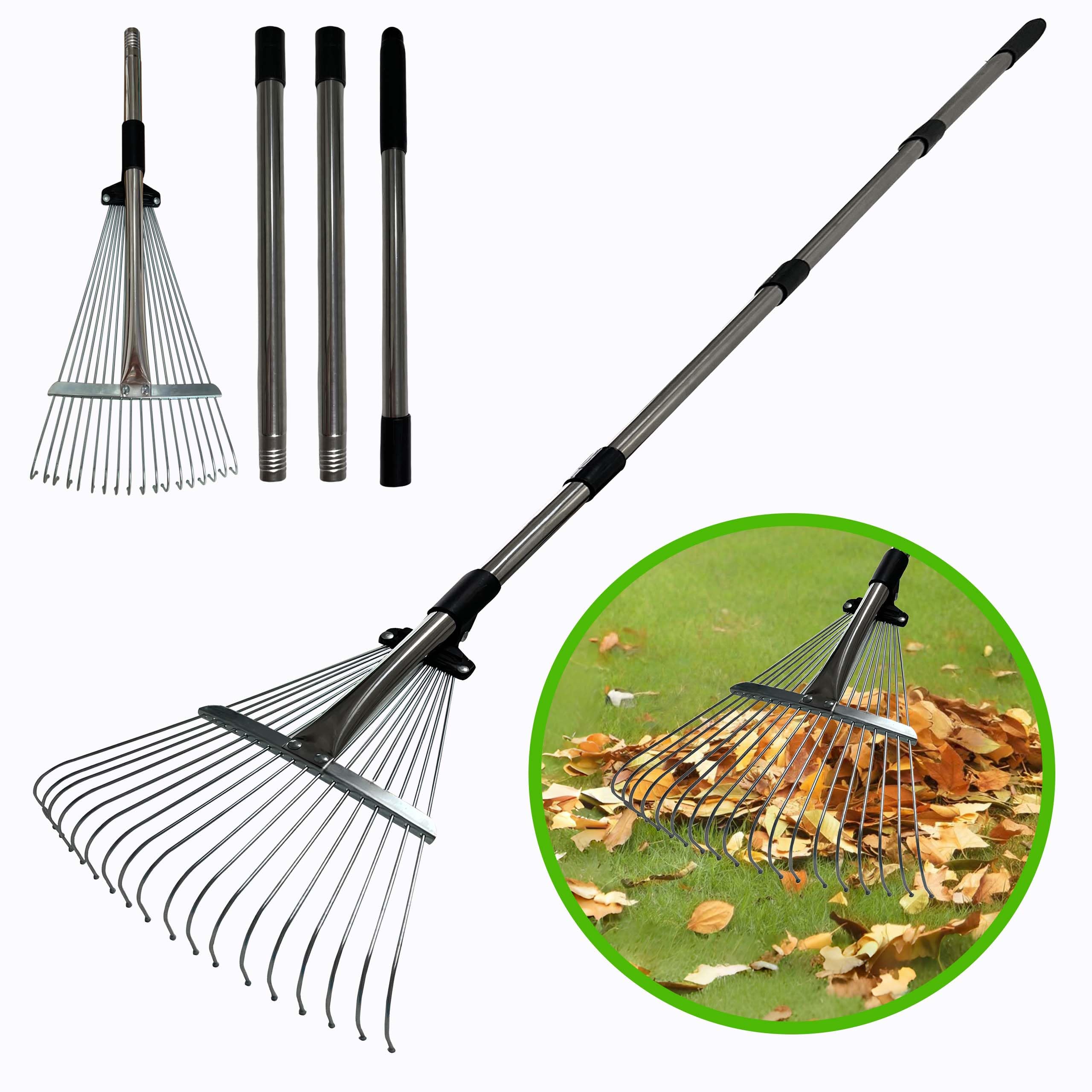 Rastrillo de jardín ajustable para hojas de 36 a 73 pulgadas de mango largo, 18 pulgadas de ancho, resistente con 25 dientes de me