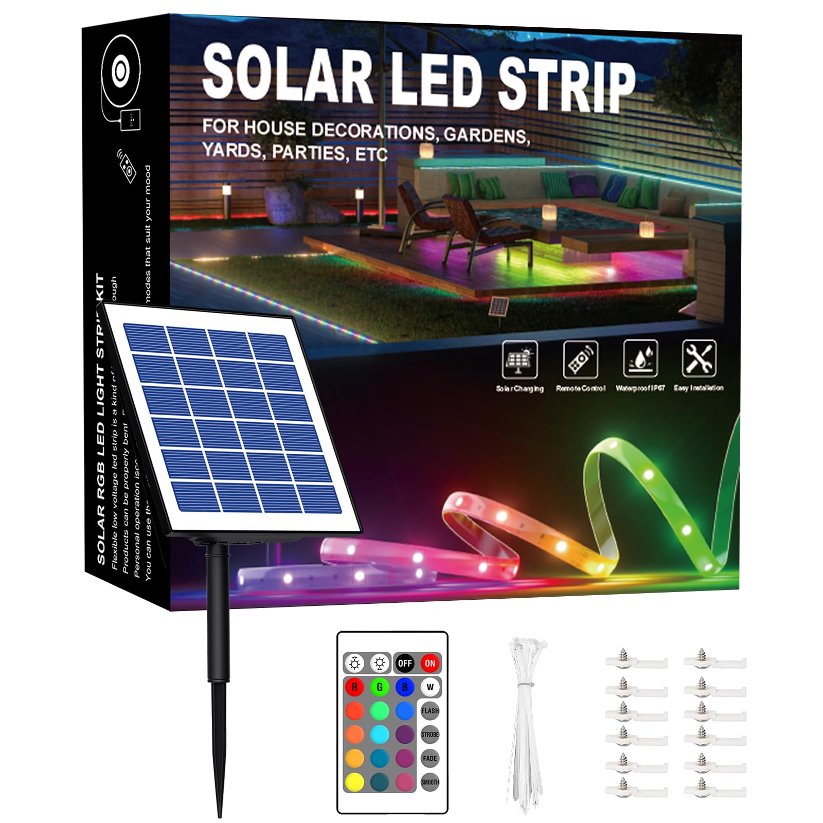 Tira de luces LED RGB de 50 pies para exteriores, impermeables, tira de luces LED solares para exteriores con autoadhesivas, 8 mod
