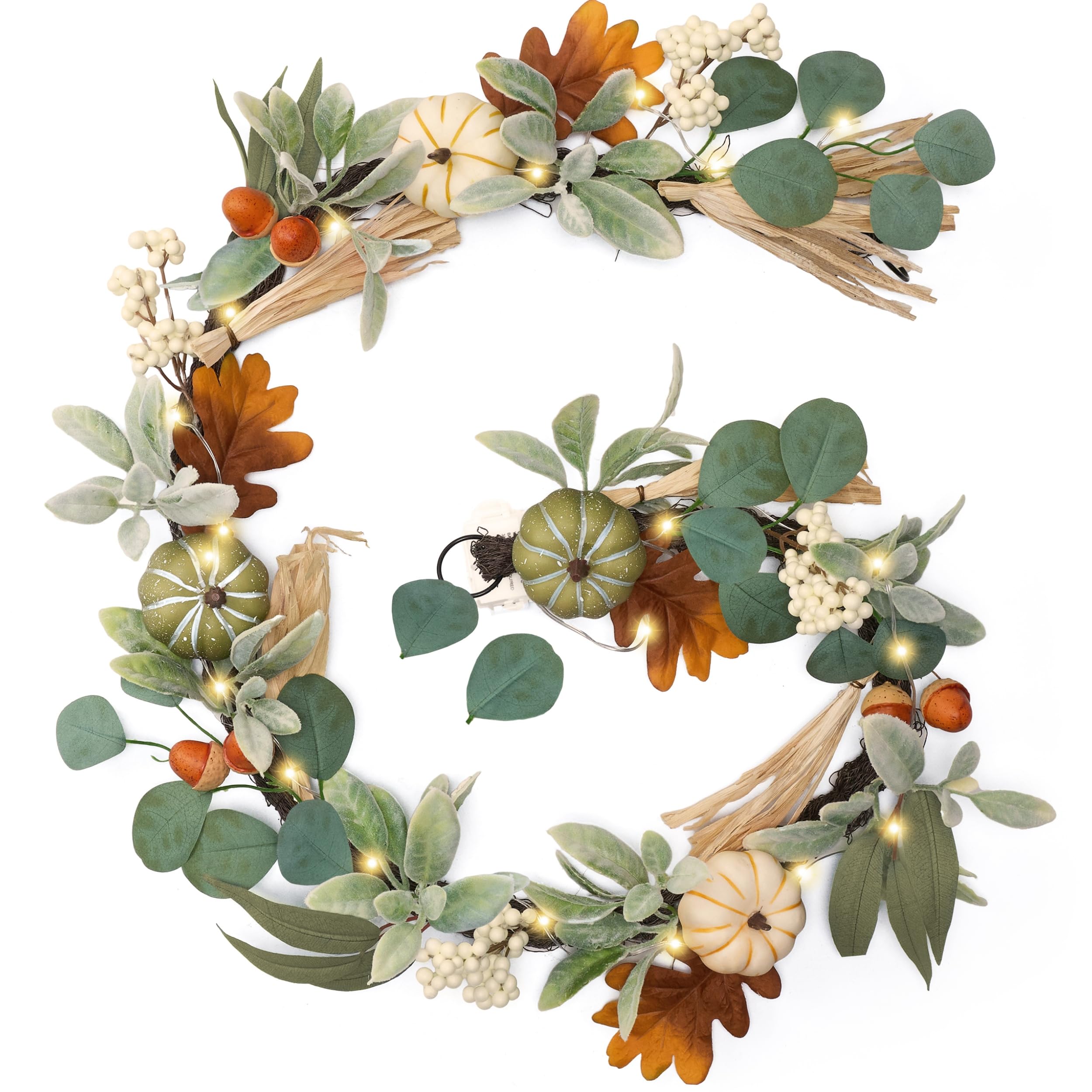 Valery Madelyn Guirnalda de otoño para manto, guirnalda de orejas de cordero, hojas con luces, calabazas blancas, centro de mesa d