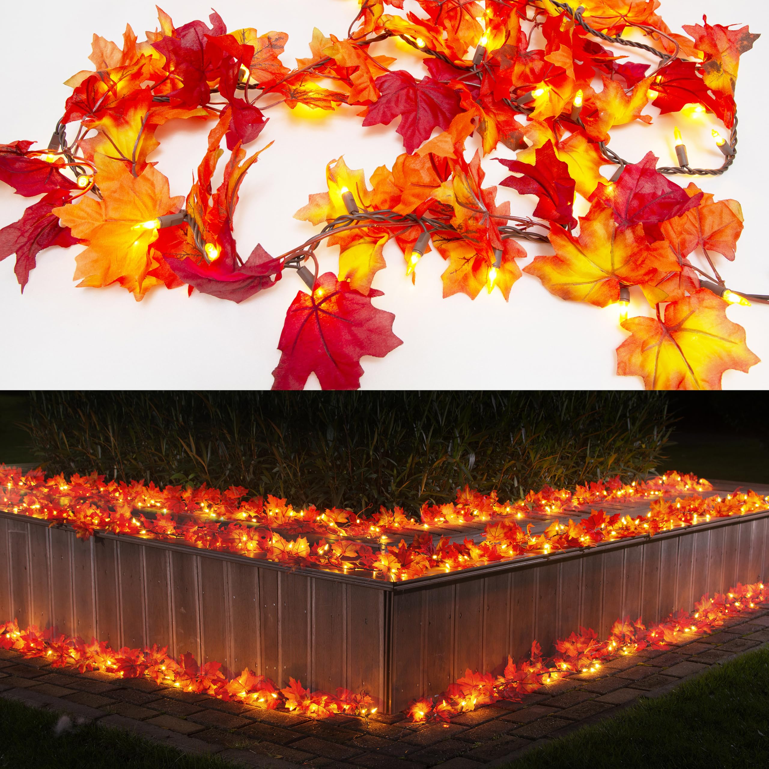 Guirnalda de otoño iluminada, 9 pies, 50 luces incandescentes, cable marrón, certificado UL, conectable, hojas de arce, luces para