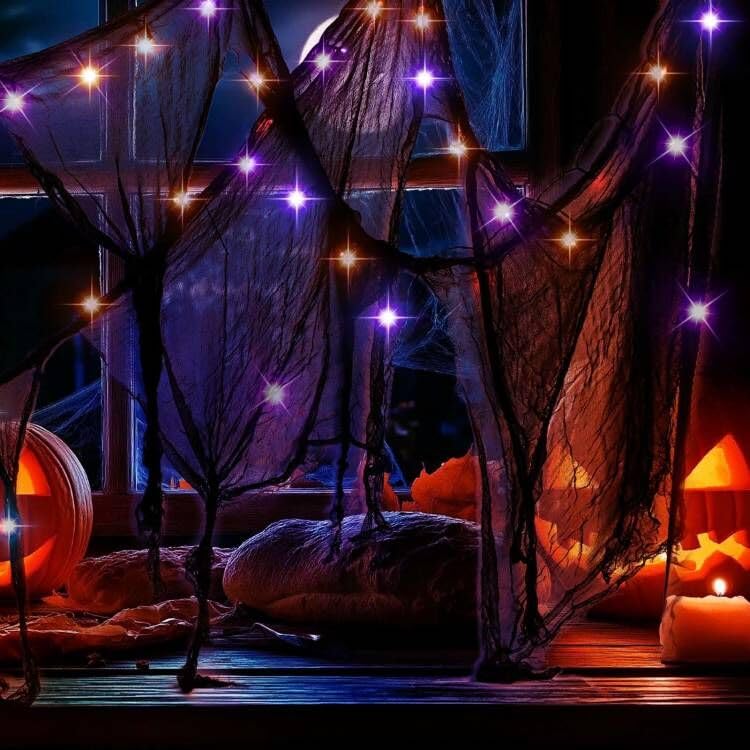 Guirnalda de luces de Halloween de color morado y naranja, guirnalda de gasa negra gótica de 16 pies con 8 modos de funcionamiento