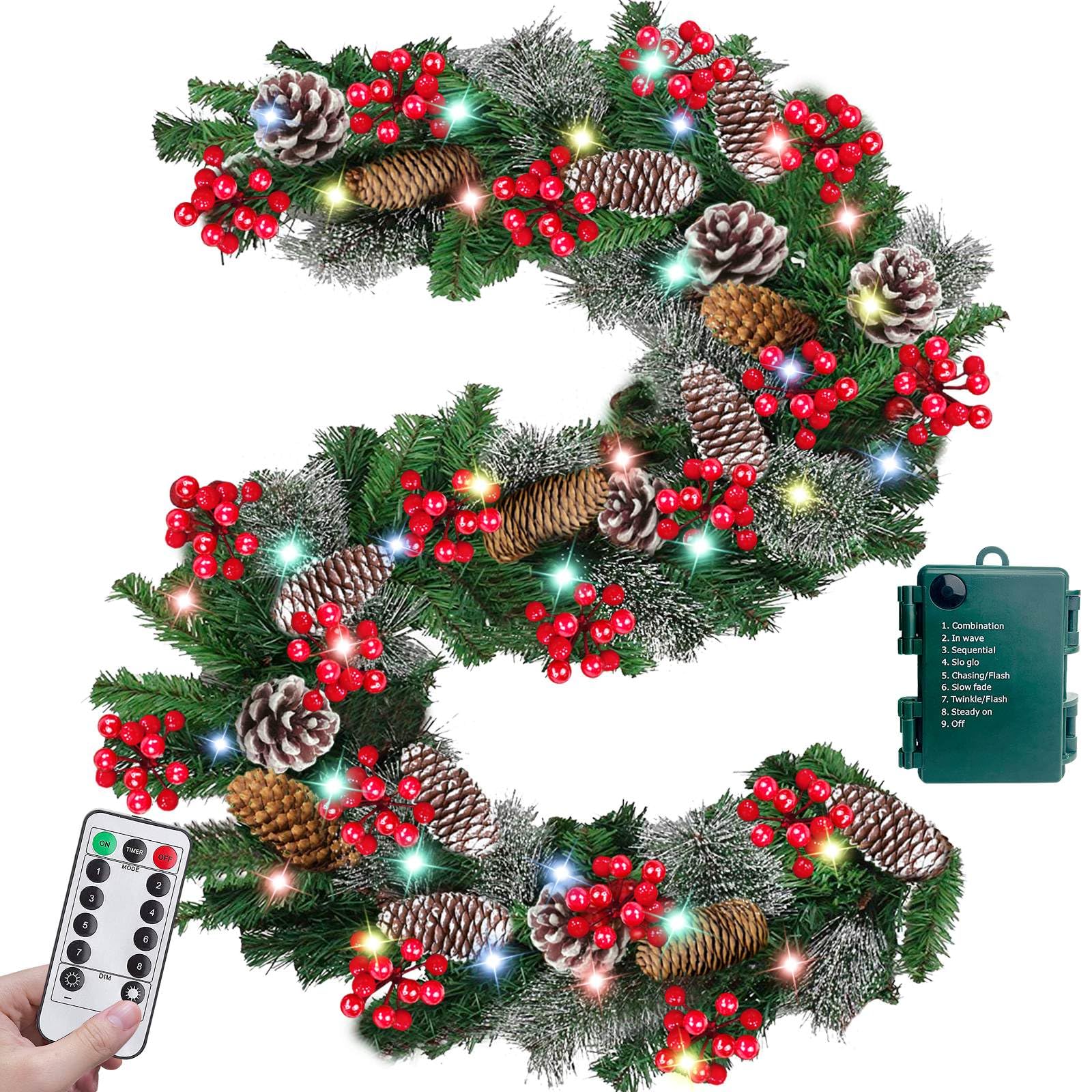 Guirnalda de Navidad con 100 luces LED de 9 pies por 10 pulgadas a batería, preiluminada, guirnalda de pino iluminada para exterio