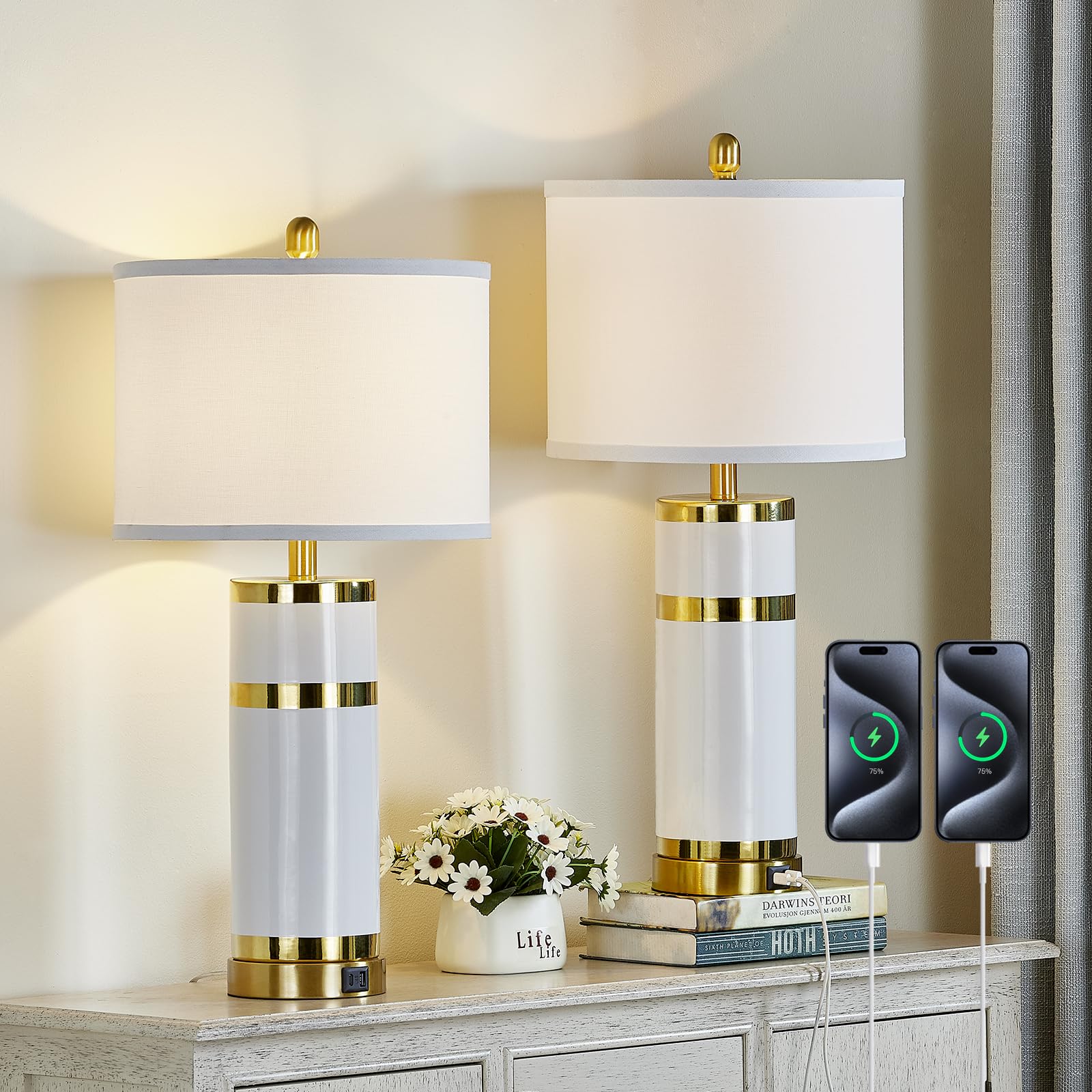 Juego de 2 lámparas de mesa decorativas de cerámica bañadas en oro de 28 pulgadas con enchufe E26 e interruptor giratorio, puertos