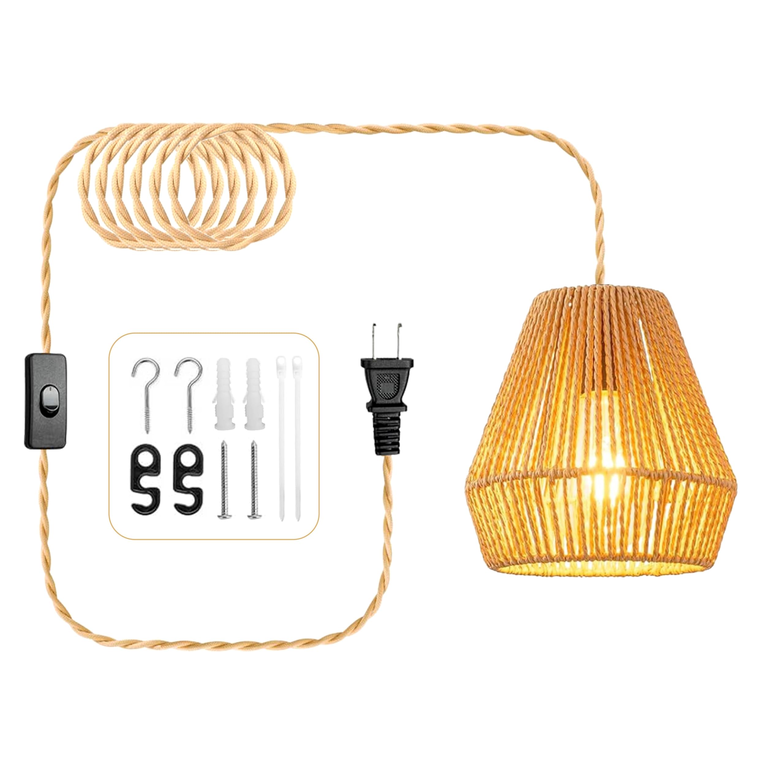 Lámpara colgante enchufable con bombilla de cristal regulable de 3 vías incluida con cable de enchufe y pantalla tejida de papel.