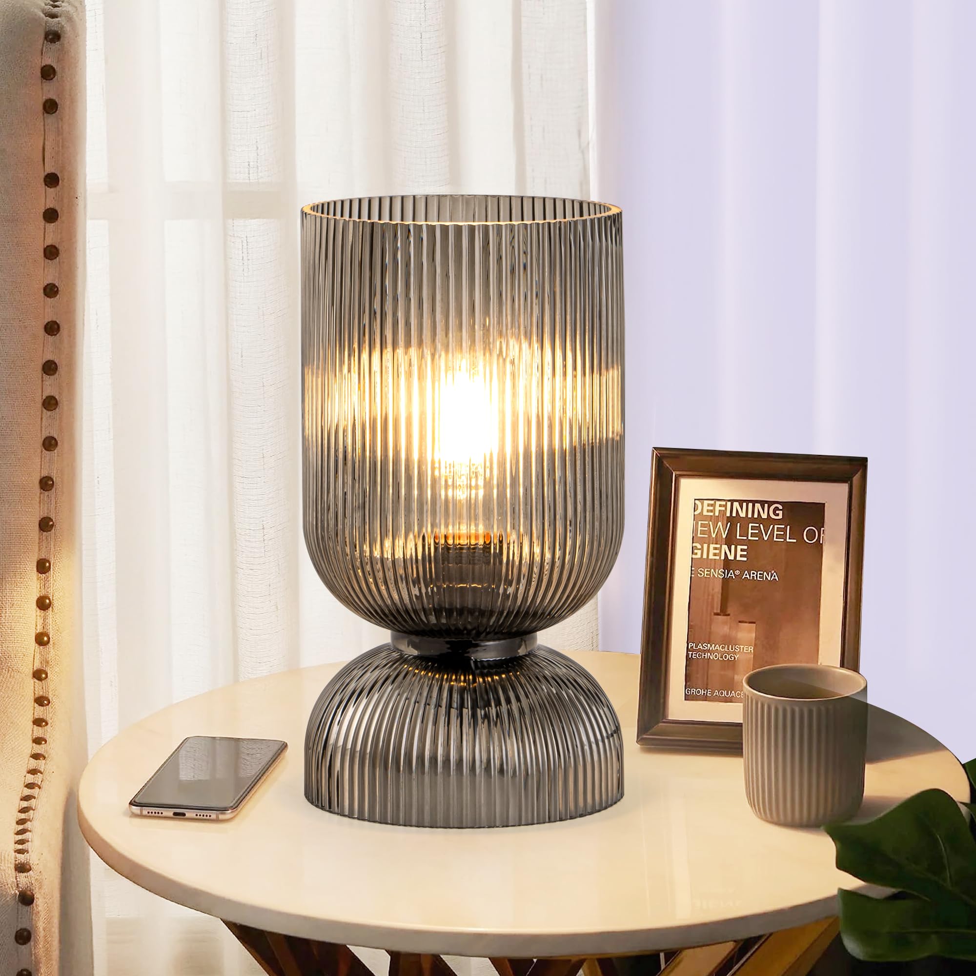 Lámpara de mesa moderna, lámpara de mediados de siglo con pantalla de cristal gris ahumado, lámpara de noche con interruptor de en