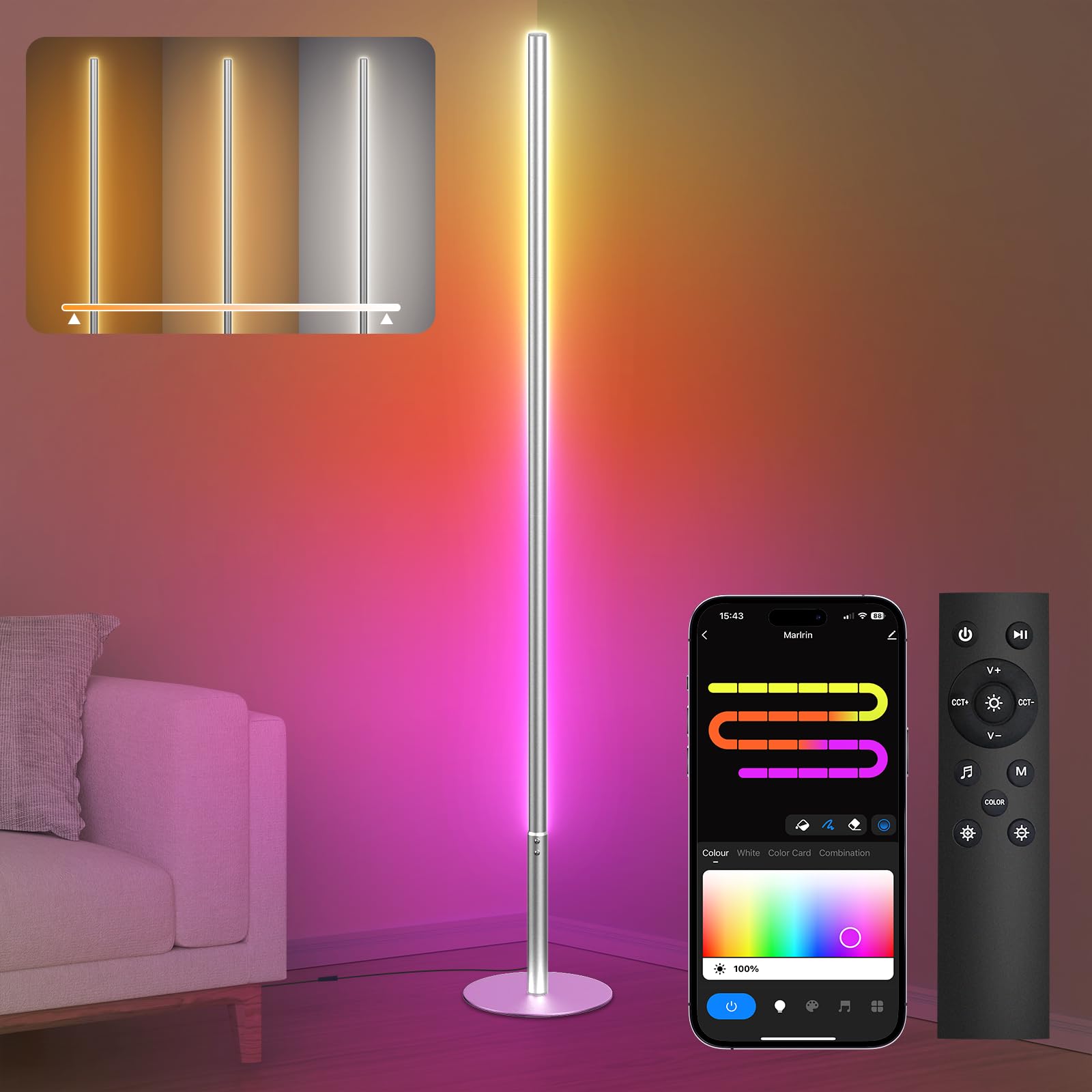 Marlrin RGBW – Lámpara de pie LED que cambia de color, lámpara moderna con sincronización de música, compatible con Alexa, aplicac