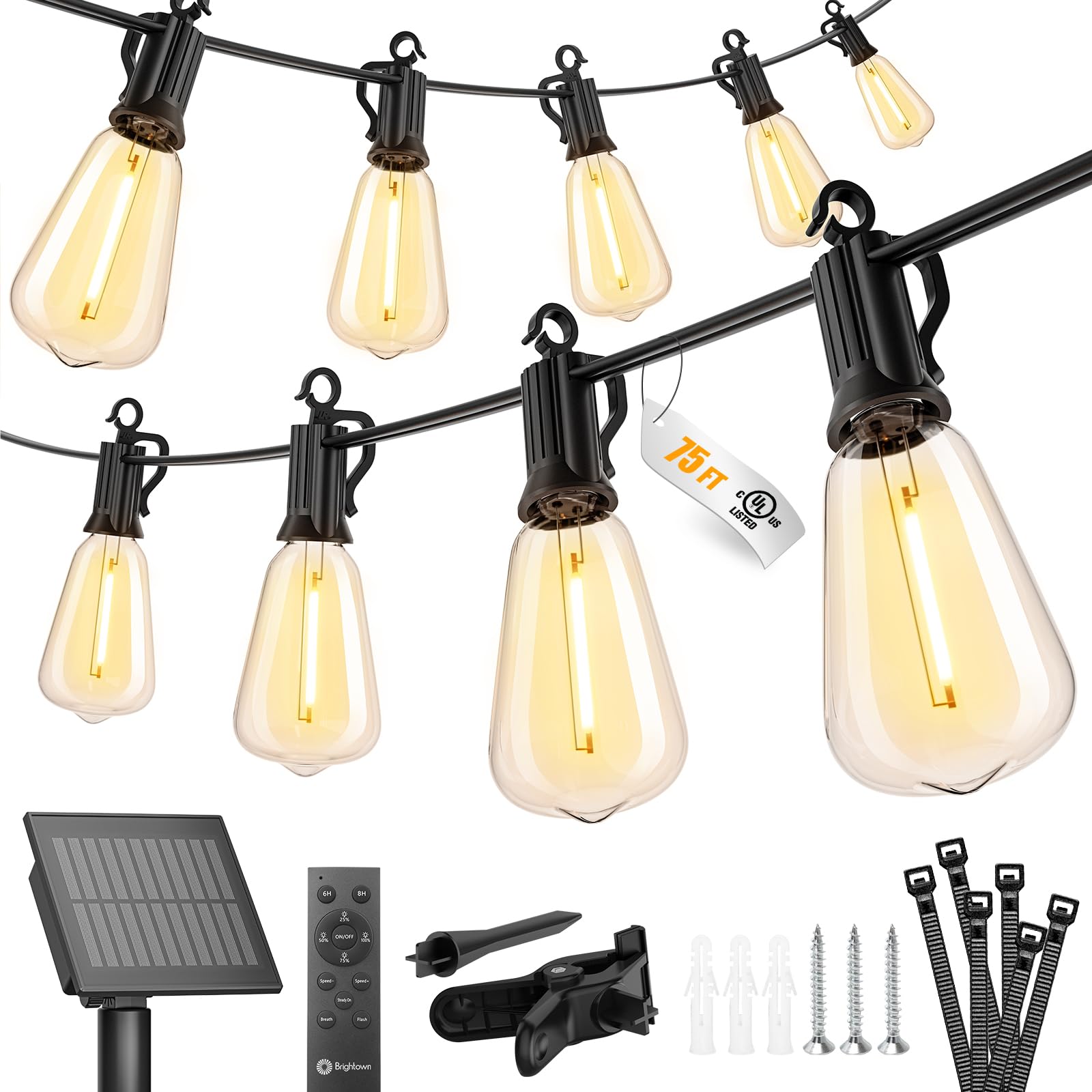 Brightown Guirnalda de luces solares para exteriores, impermeables, de 75 pies con 35 bombillas LED ST38 inastillables, luces sola