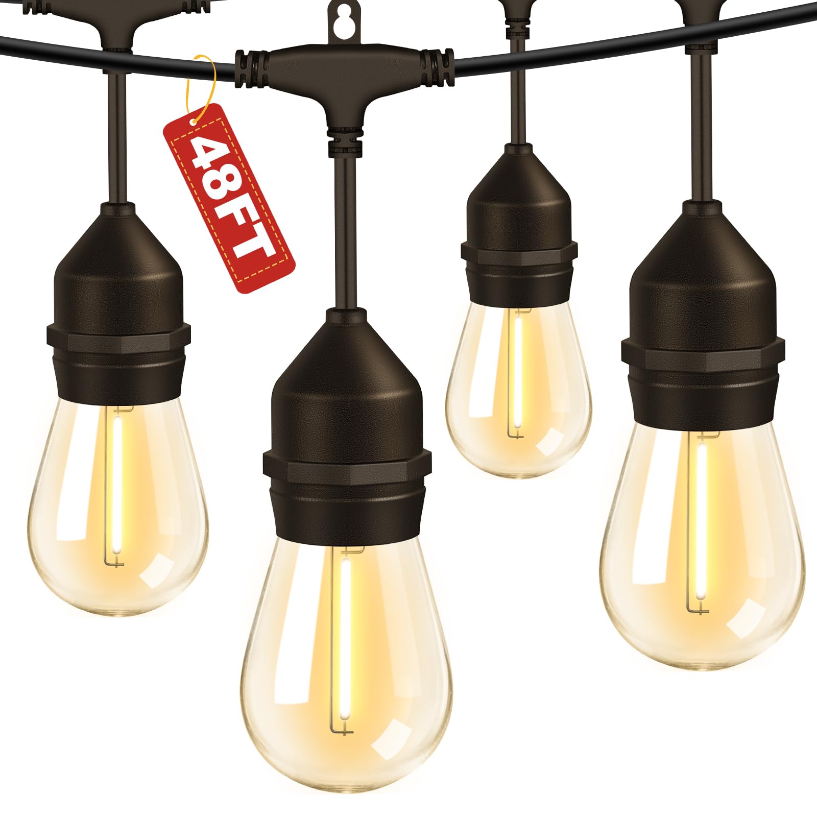 Cadena de luces LED para exteriores de 48 pies con 15+2 bombillas inastillables, IP65 impermeable, luces de grado comercial para p