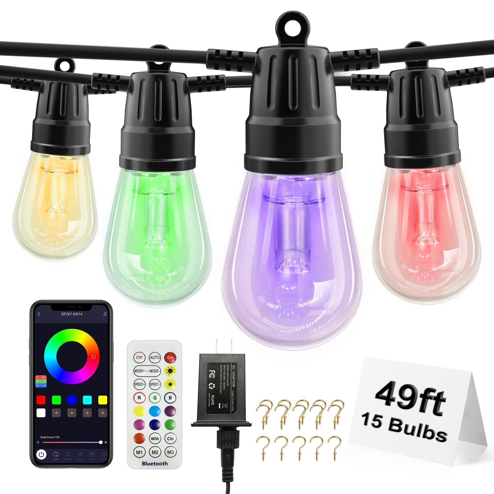Voneta Tira de luces RGBW para exteriores, 49 pies, 15 bombillas de patio con control remoto y aplicación, S14 regulable que cambi