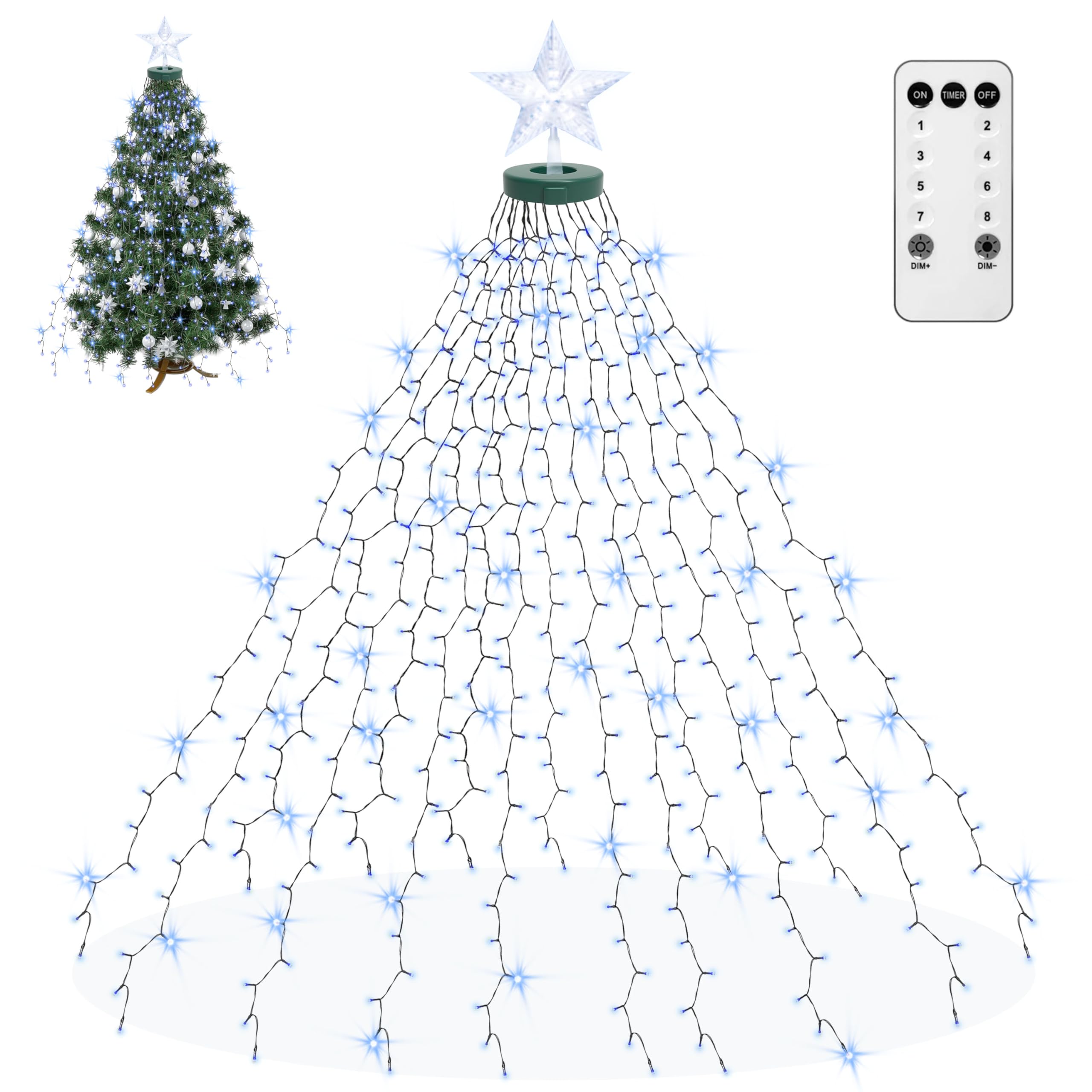 Aneeway Luces de árbol con decoración de estrella, 410 luces LED con 8 modos y función de memoria, tira de luces de 6.6 pies x 16