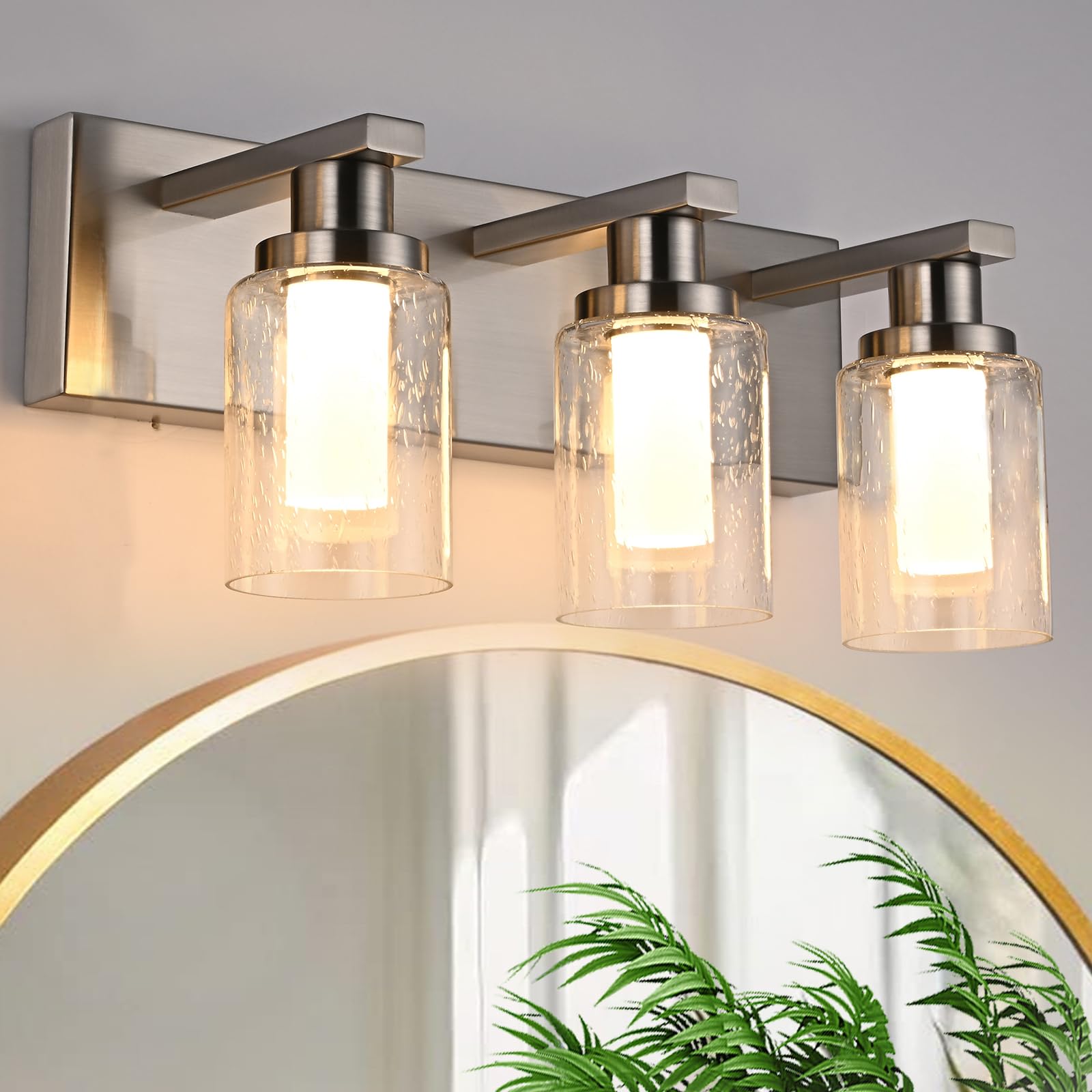 3 luces LED de 5 CCT para tocador de baño, níquel cepillado, moderna iluminación de pared de baño con pantalla de vidrio sembrado