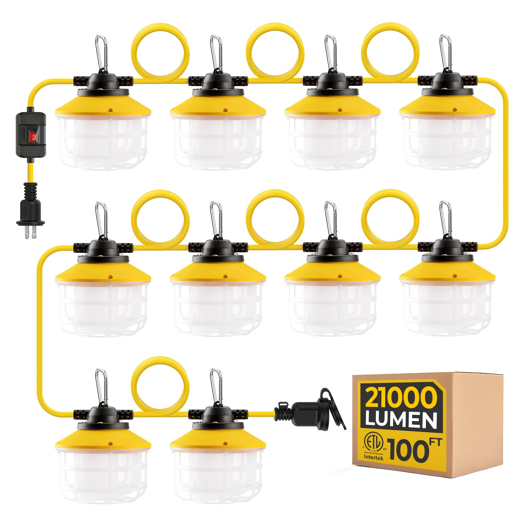 Cadena de luces LED de construcción al aire libre con interruptor: 100 pies, 150 W, 21000 lm, certificado ETL, iluminación tempora