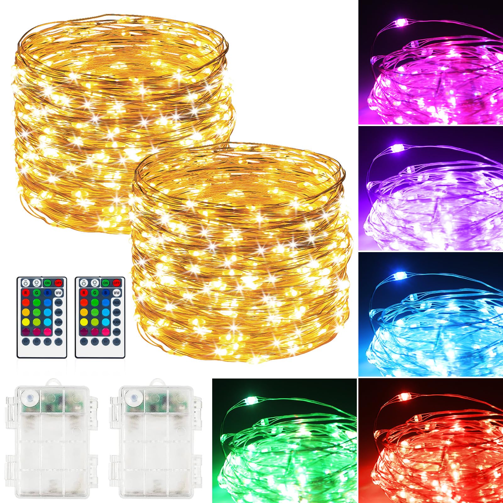 Paquete de 2 luces de hadas a batería, total de 78 pies, 240 LED, funciona con pilas con control remoto y temporizador, luces RGB