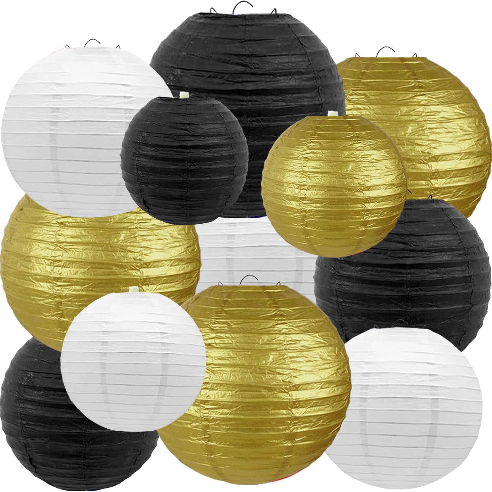 Faroles de papel redondos colgantes de color negro dorado y blanco, 12 unidades, para decoración de Año Nuevo, graduación, baby sh