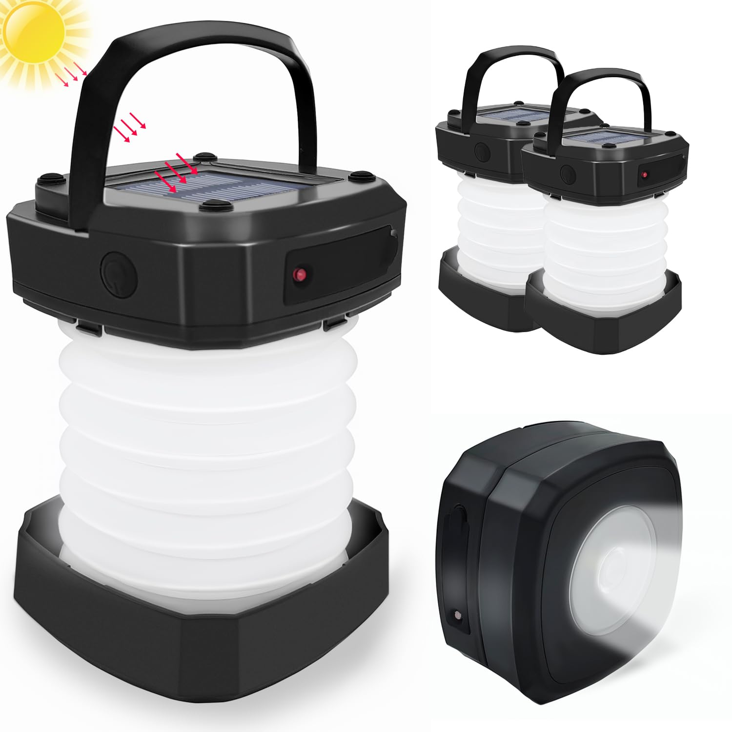 Linterna de linterna de energía solar, paquete de 2 linternas LED plegables para camping, lámpara recargable USB portátil para cor