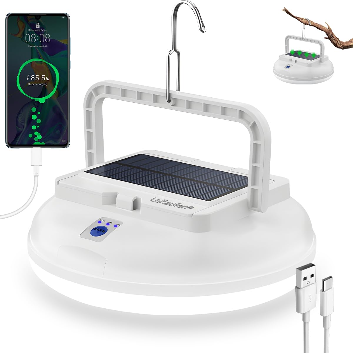 Luz solar de camping de 4500 lm, linterna de camping portátil para colgar IPX4 impermeable, lámpara recargable por USB brillante p