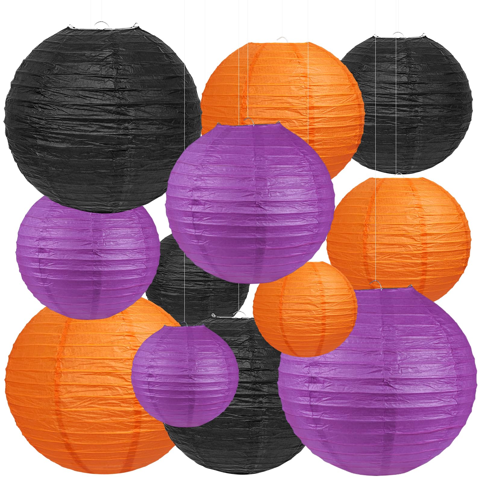 12 decoraciones de fiesta de Halloween, varios tamaños (6, 8, 10, 12 pulgadas), linternas de papel colgantes moradas y negras nara