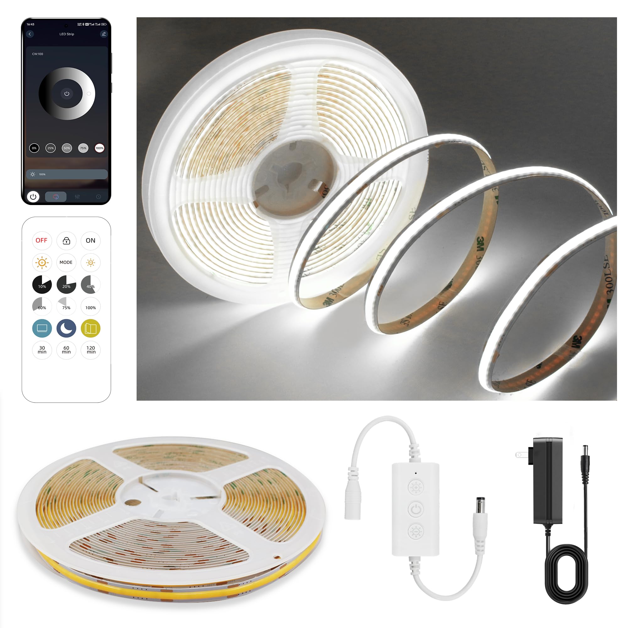 COB – Tira de luces LED de color blanco frío, 24 V, regulable, kit de tira de luz LED con control remoto y aplicación, 6000 K 9.84