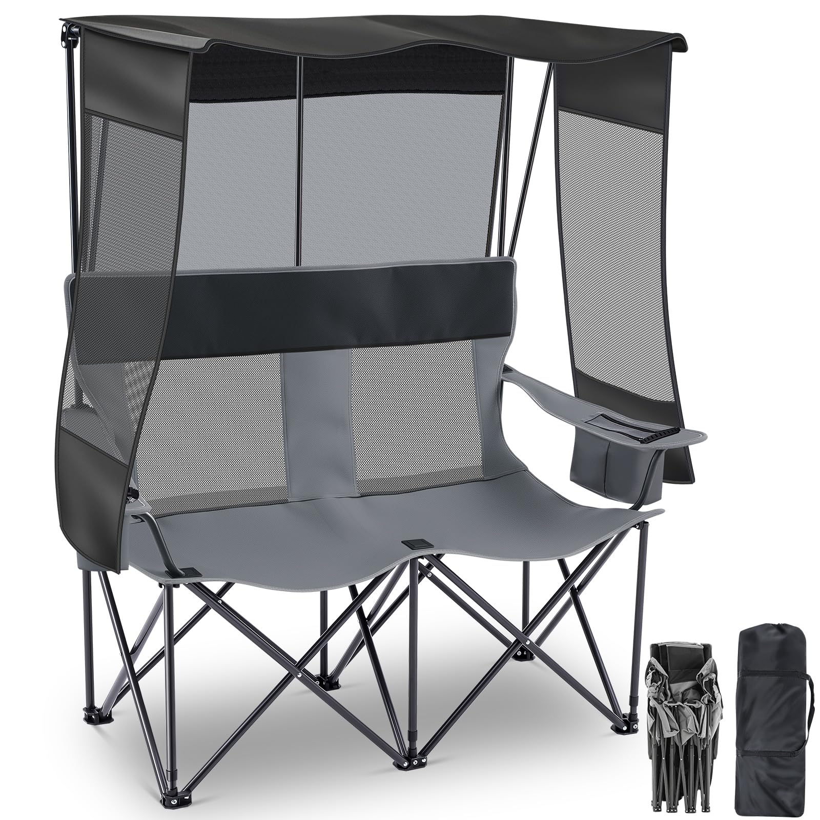Silla de camping doble con toldo para 2 personas, plegable para 2 personas, con bolsa de soporte para tazas, respaldo de malla neg