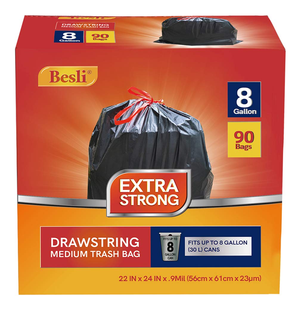 Besli Bolsa de basura con cordón negro de 8 galones, bolsa de basura con forro de 0.9 mil, 90 unidades