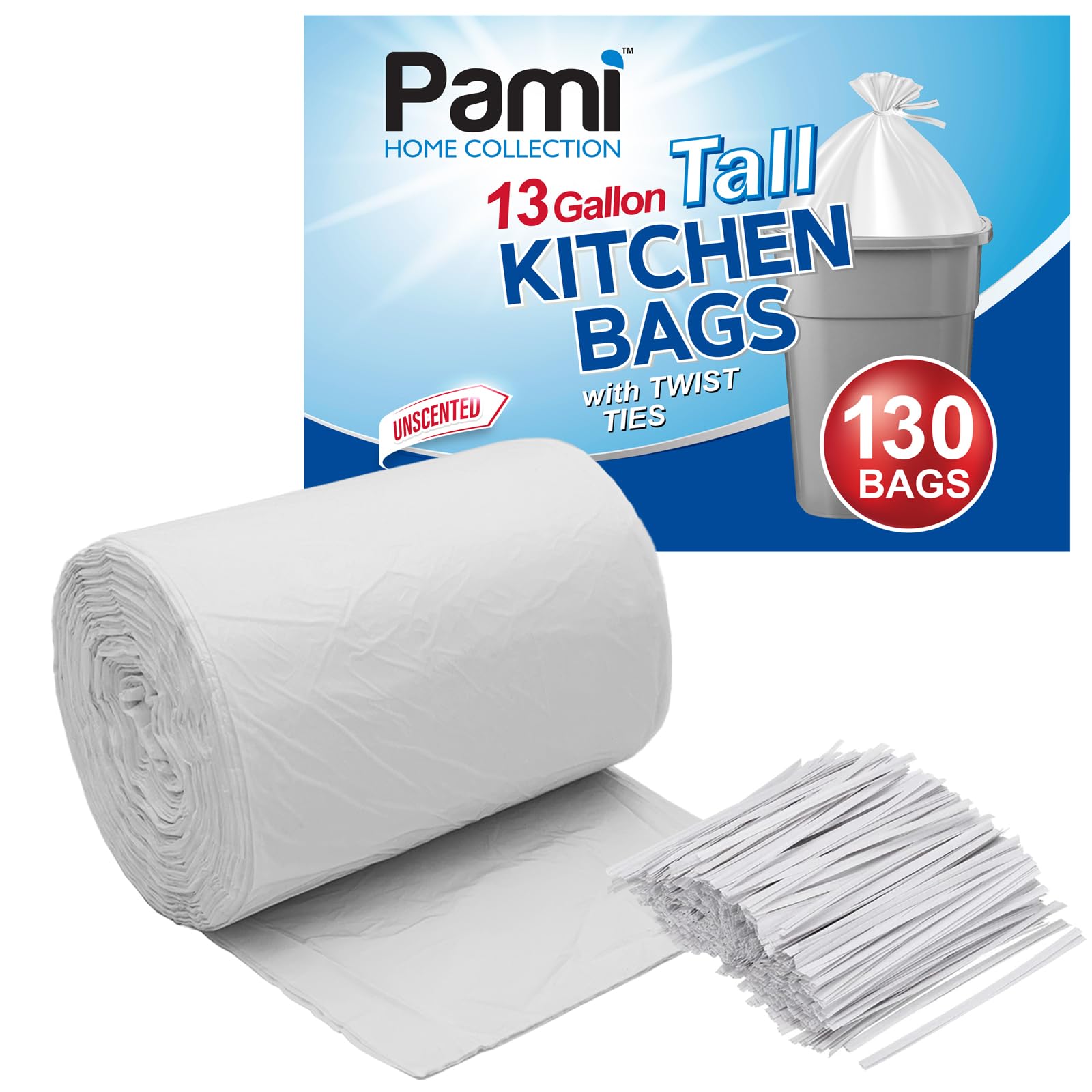 PAMI Bolsas de basura altas de 13 galones [130 unidades, blancas] con lazos giratorios, sin perfume, con control de olores, bolsas