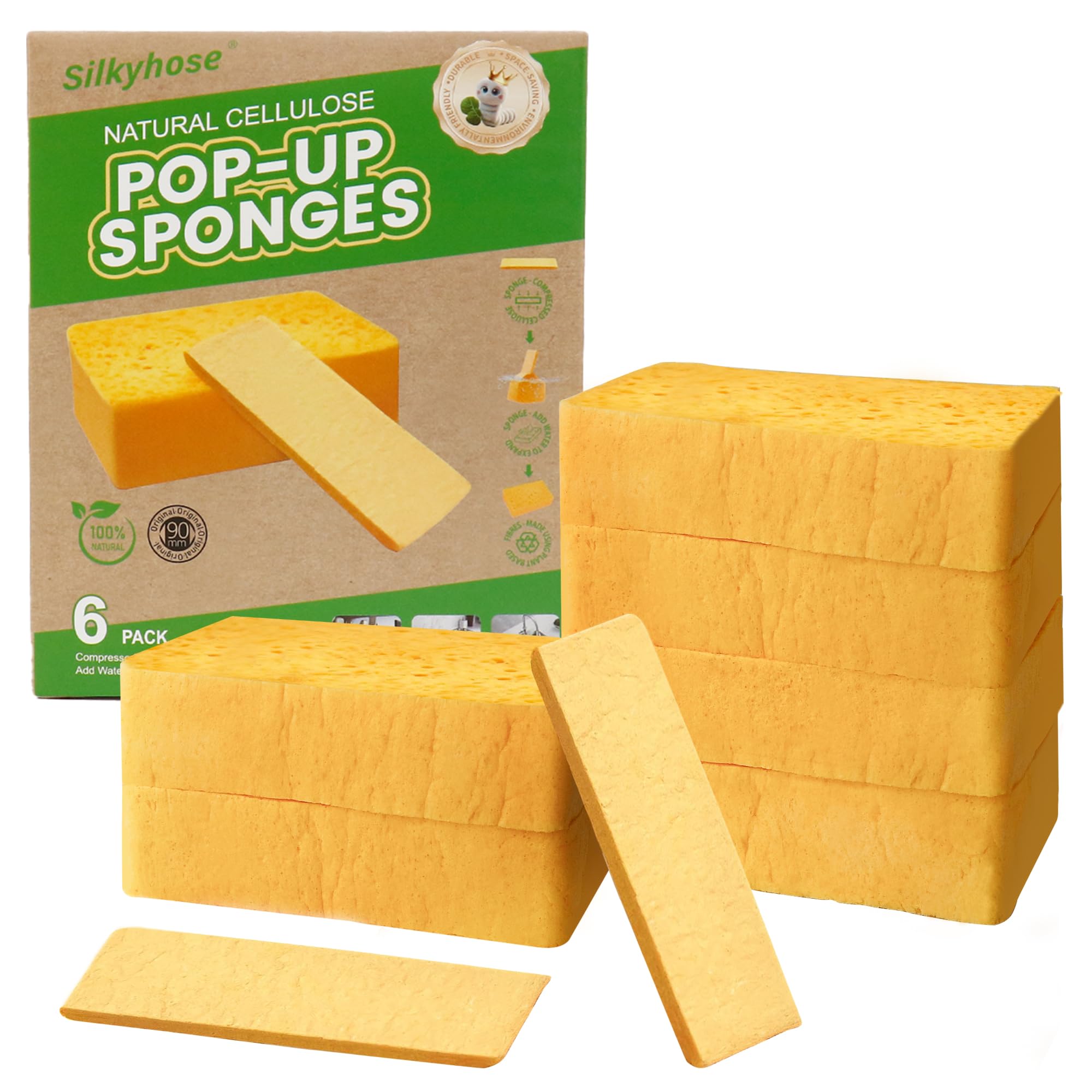 Paquete de 6 esponjas de celulosa natural, biodegradables, ecológicas, comprimidas, antiarañazos, multiuso para platos de cocina,