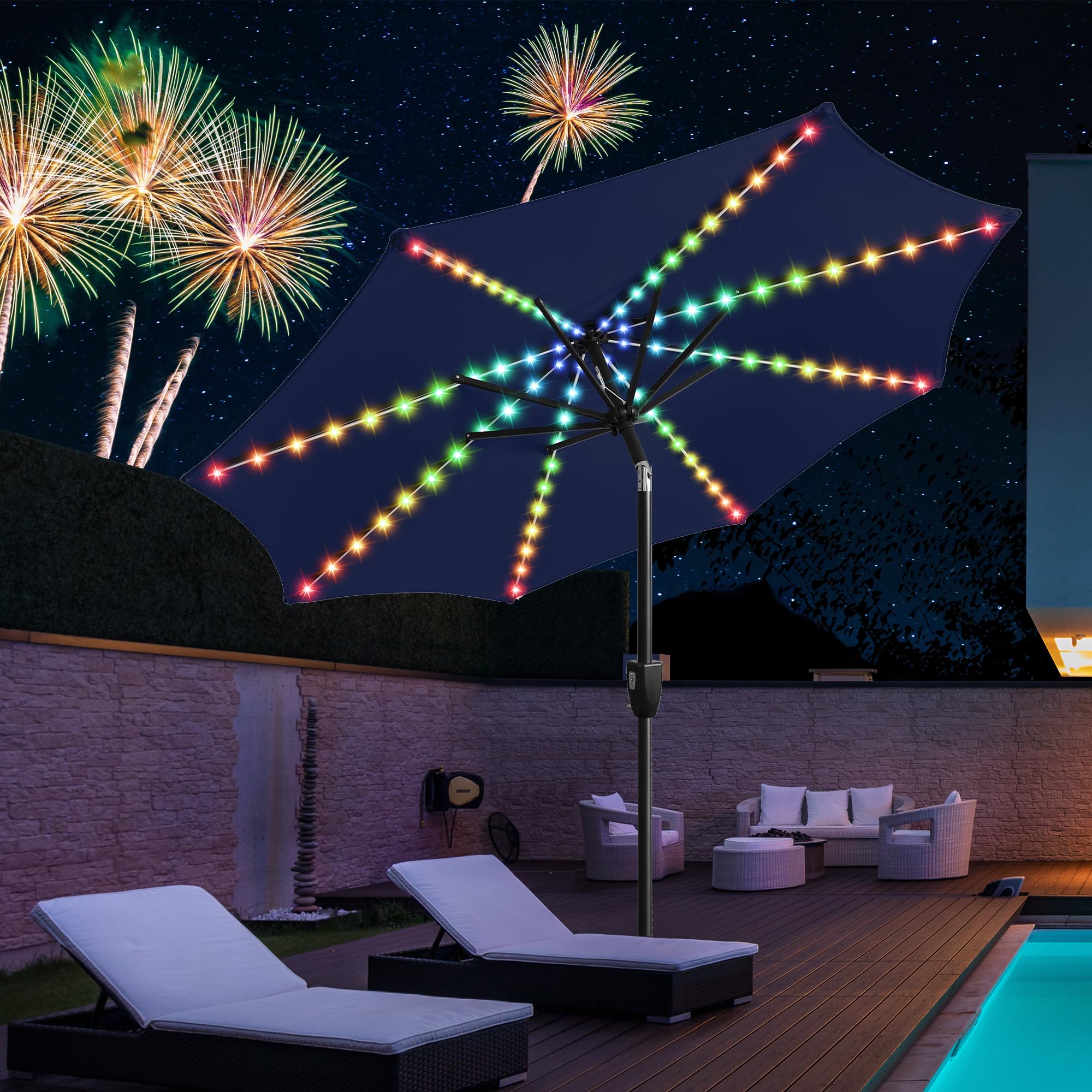 FRUITEAM Sombrilla de patio con luces LED solares coloridas, sombrilla resistente de 7.5 pies con más de 200 modos de luz, protecc