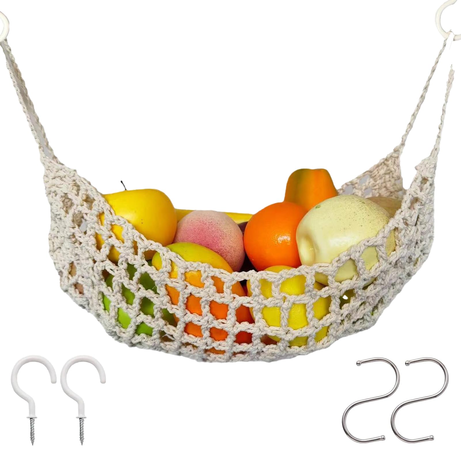 Hamaca colgante de frutas debajo del gabinete, cesta de frutas colgante de macramé de 13 x 16 pulgadas con 4 ganchos, red de fruta
