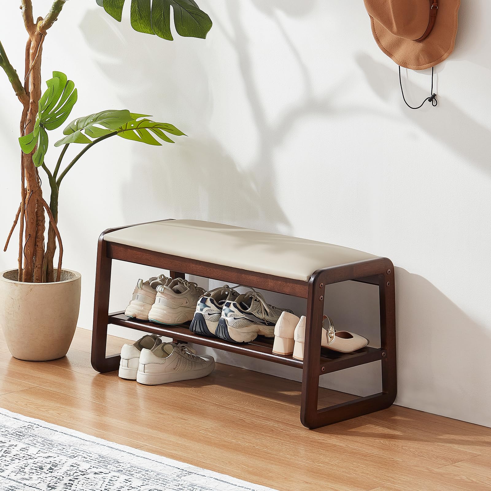 Banco de zapatos, banco de entrada de madera maciza, almacenamiento de zapatos con asiento acolchado para entrada, pasillo (beige,