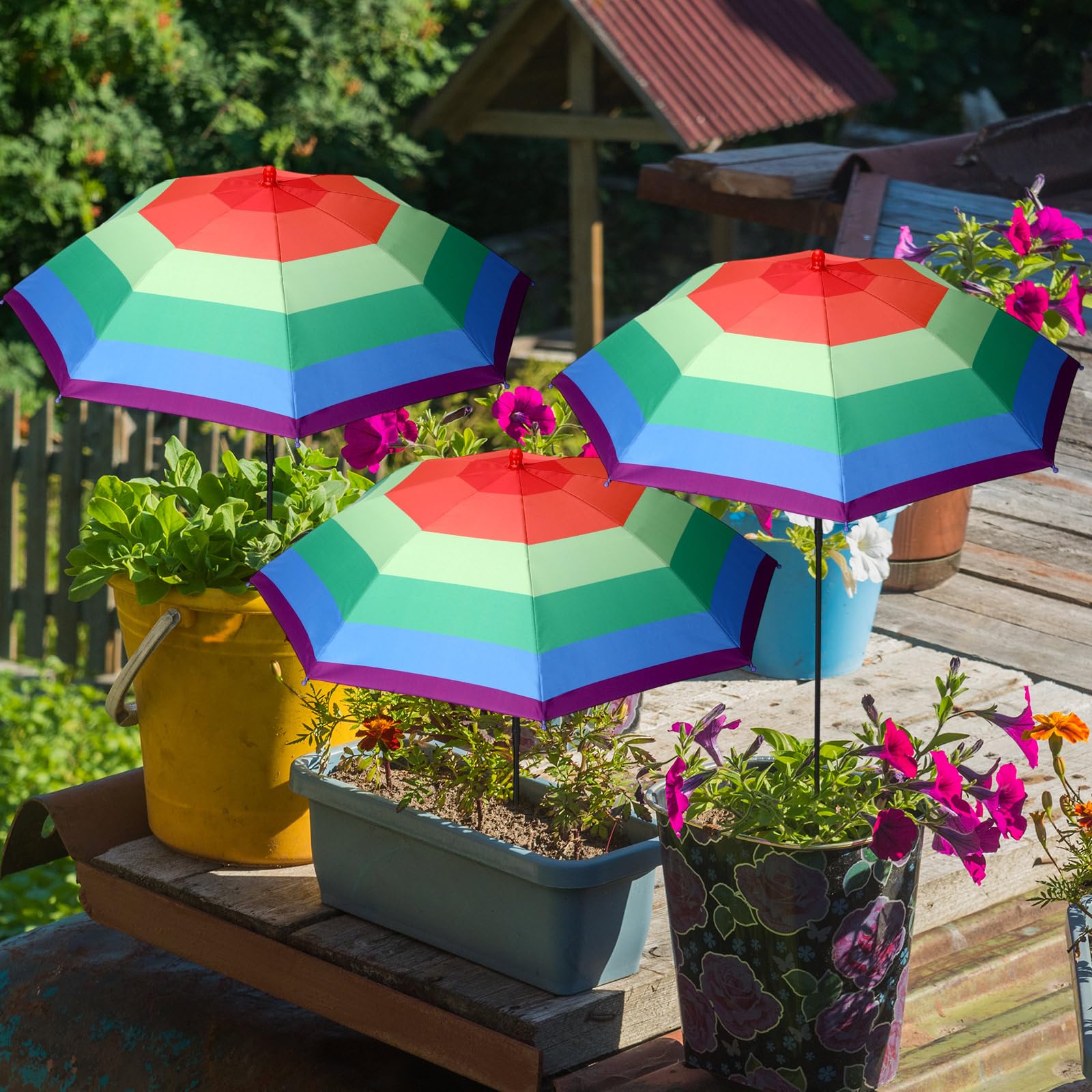 Sanwuta Paquete de 3 sombrillas de plantas de arco iris para plantas al aire libre de 40 pulgadas, ajustable, altura colorida, som