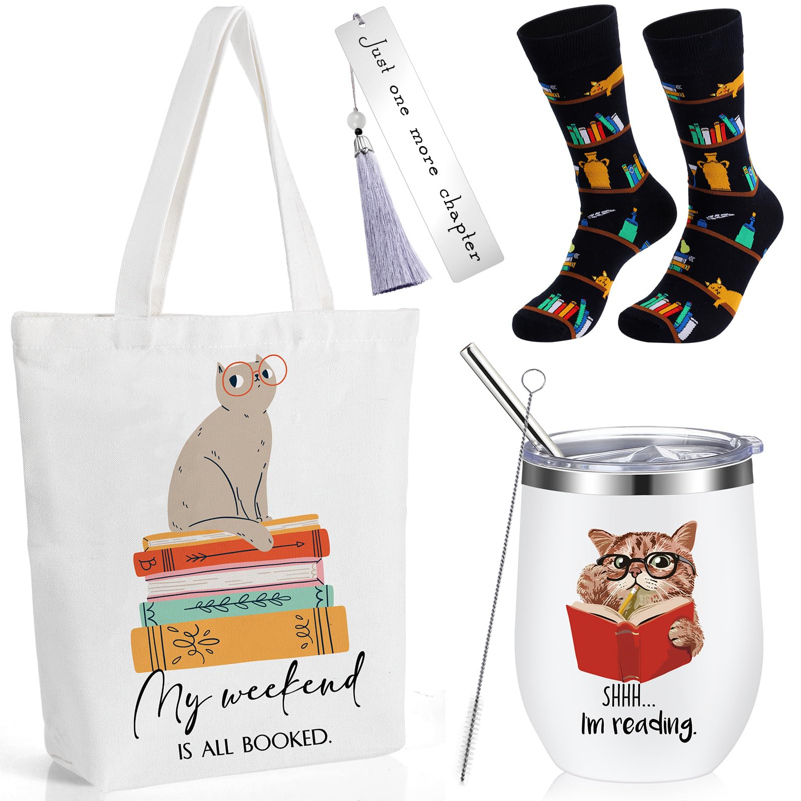 Sieral Juego de 4 regalos para amantes de los libros para mujeres, incluye calcetines novedosos de acero inoxidable de 12 onzas, v