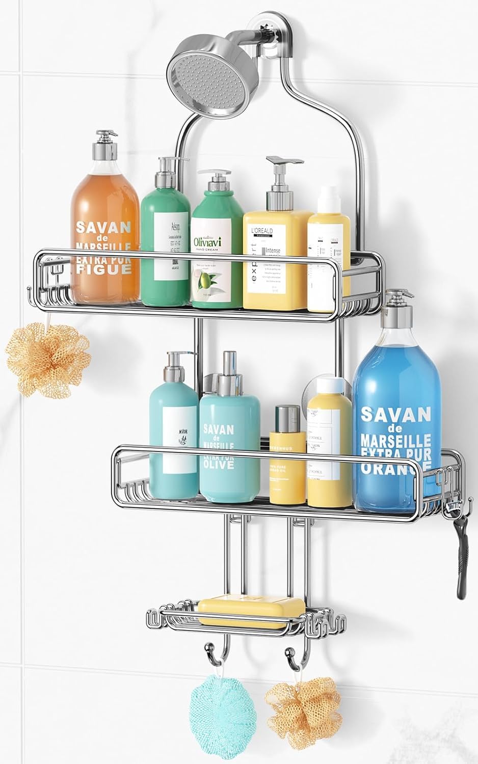 HAMITOR Ducha colgante sobre la cabeza: organizador de ducha grande ajustable con soporte para jabón, estante de baño a prueba de