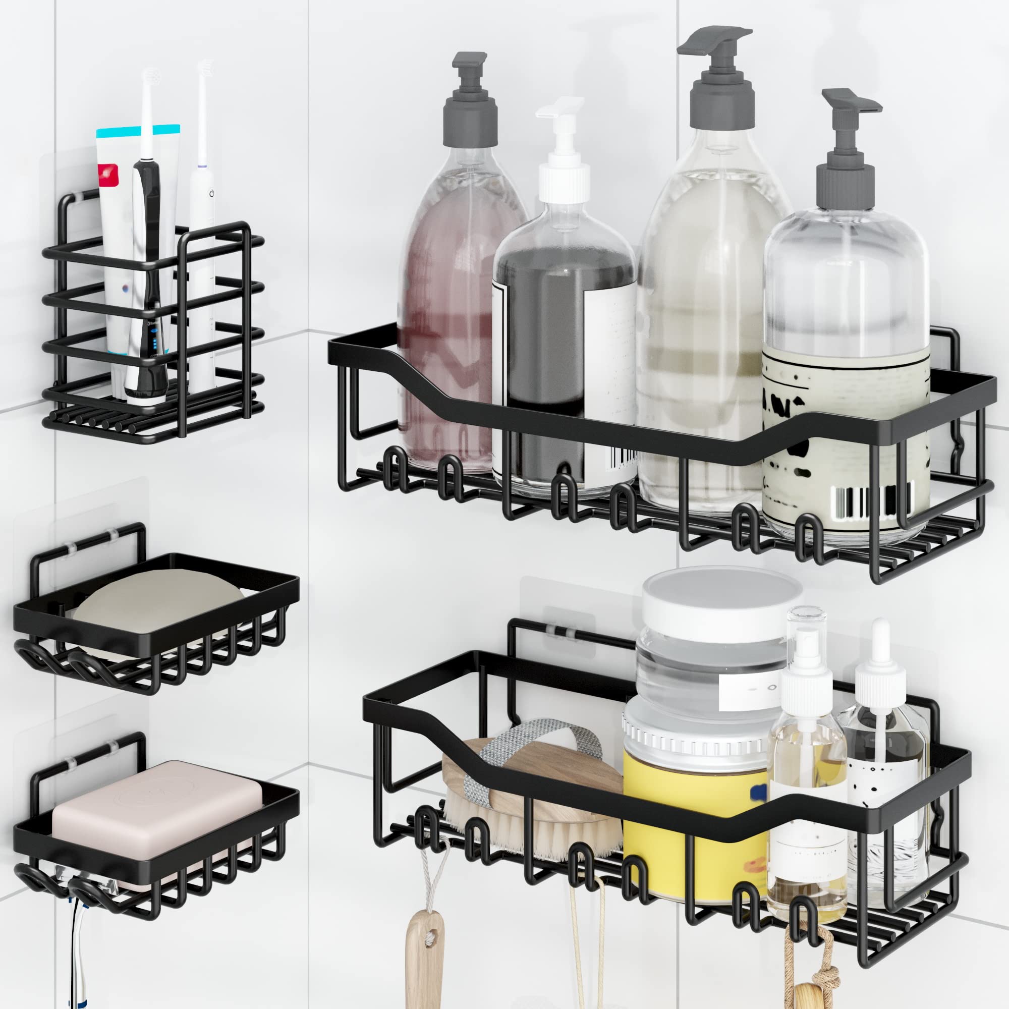 Zenna Home Juego de cestas y ganchos adhesivos para ducha, 5 piezas organizadores y almacenamiento de baño, estantes y ganchos de