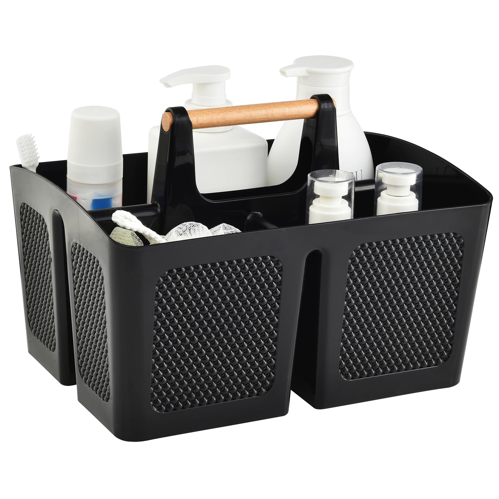 Haundry Cesta de ducha de plástico negro con 3 compartimentos, organizador portátil dividido para limpieza de baño, bolsa de almac