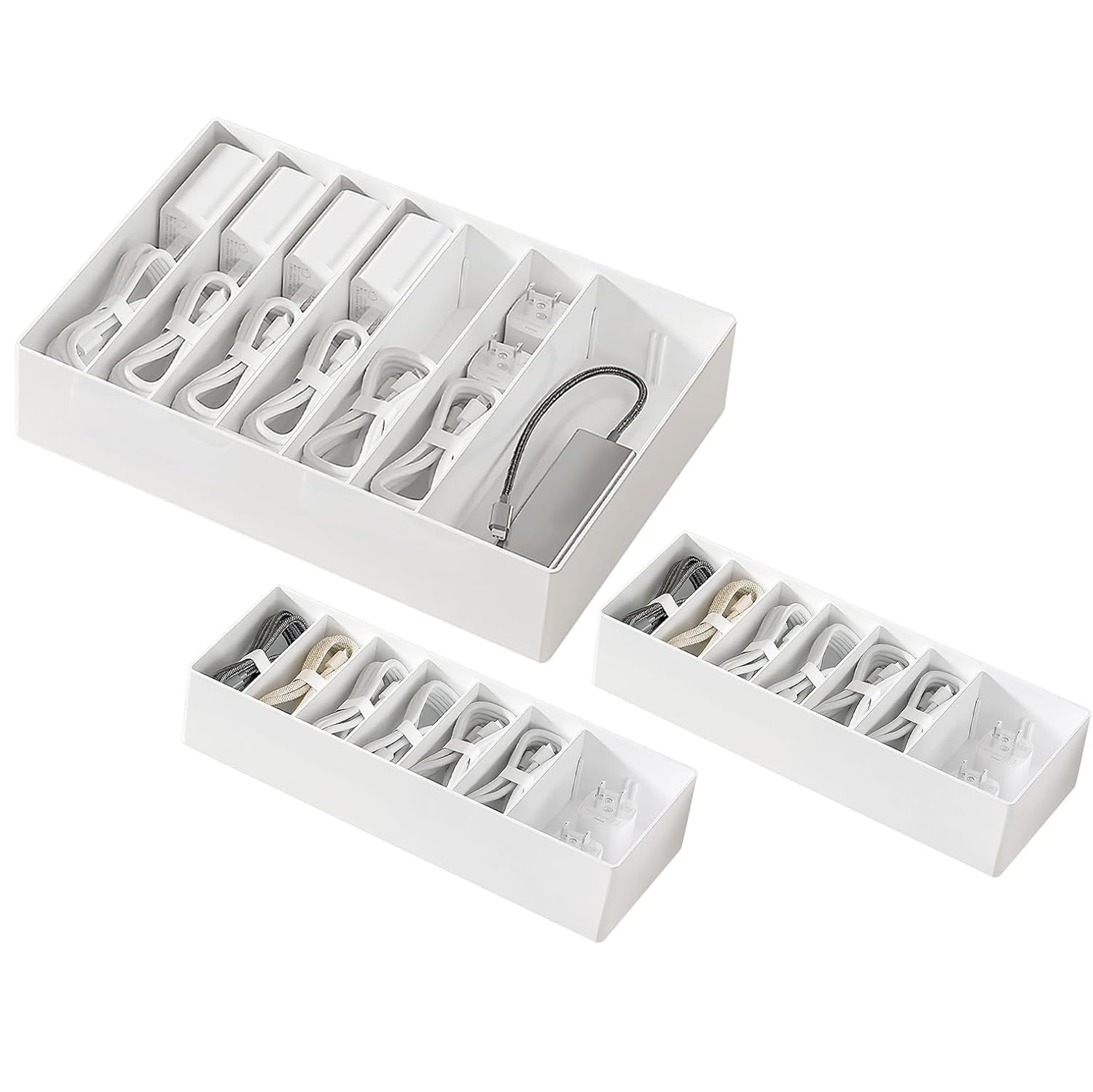 Caja organizadora de cables de 3 piezas con lazos de alambre, almacenamiento de cargador de cable de plástico con 8 compartimentos