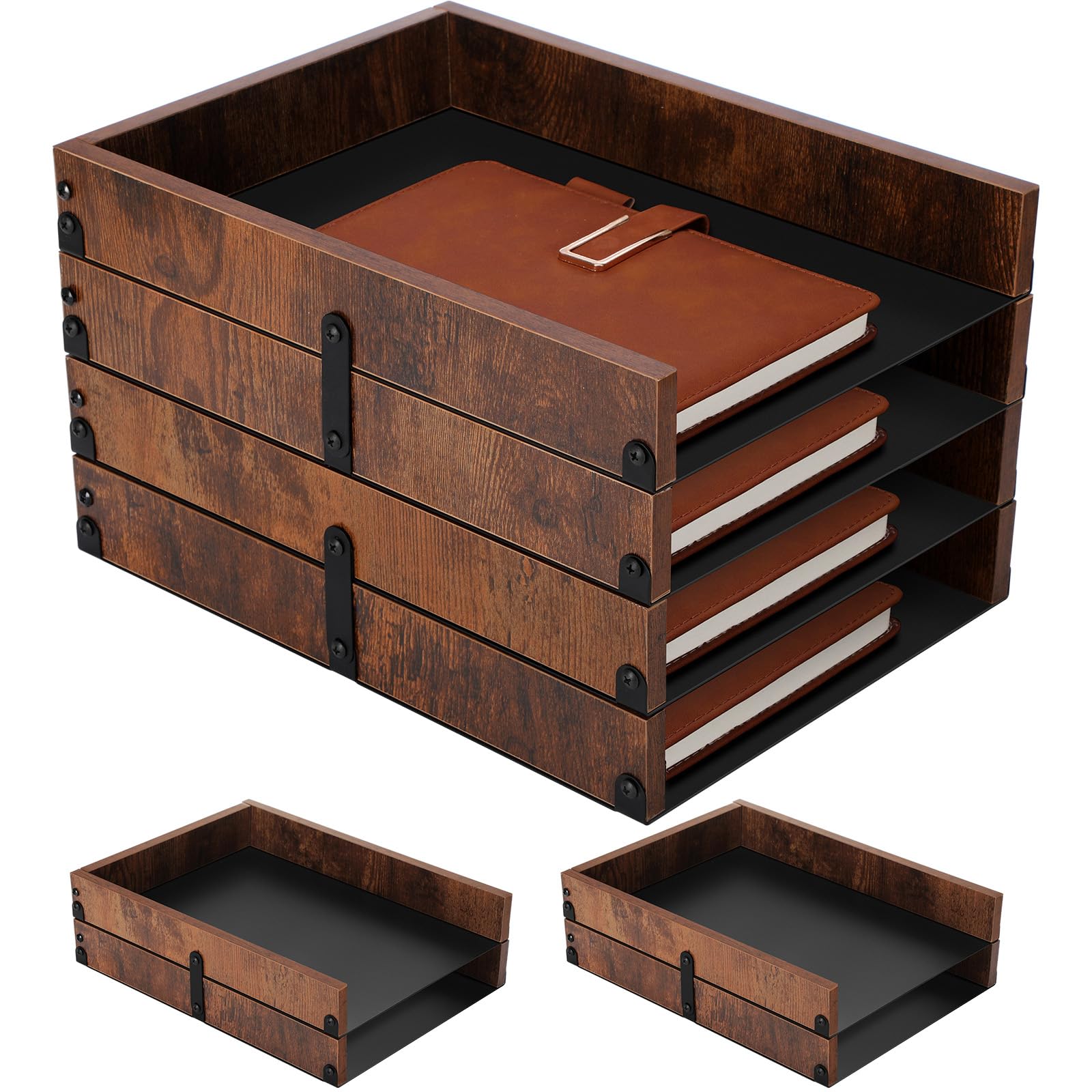 4 bandejas de madera y metal para cajón de escritorio, bandeja de papel apilable, organizador de almacenamiento de escritorio, sop