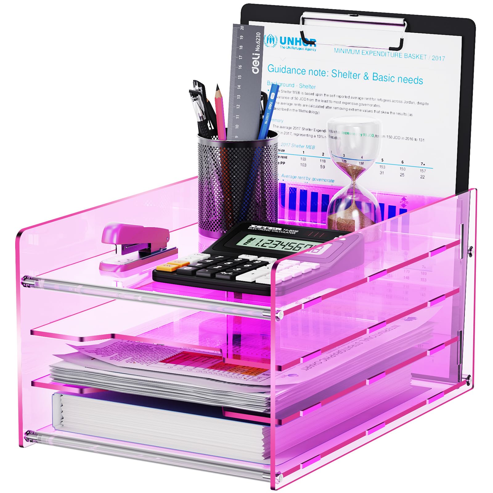 Organizador de papel acrílico para escritorio, organizador de bandeja de archivos de papel, organizador de oficina (rosa)