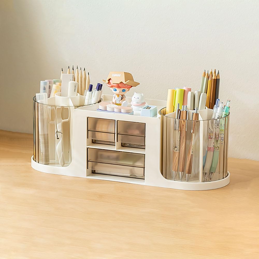 Organizador de escritorio – 6 ranuras de 360° giratorio para lápices con 2 cajones, organizador de bolígrafos para escritorio, caj