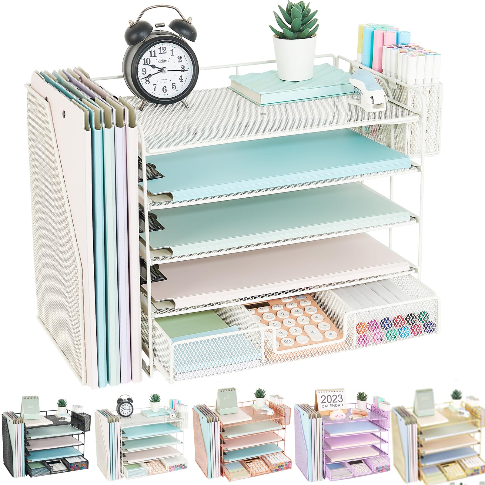 Youbetia Organizador de escritorio de 5 niveles y almacenamiento con estantes verticales de malla para archivos, bandeja de papel