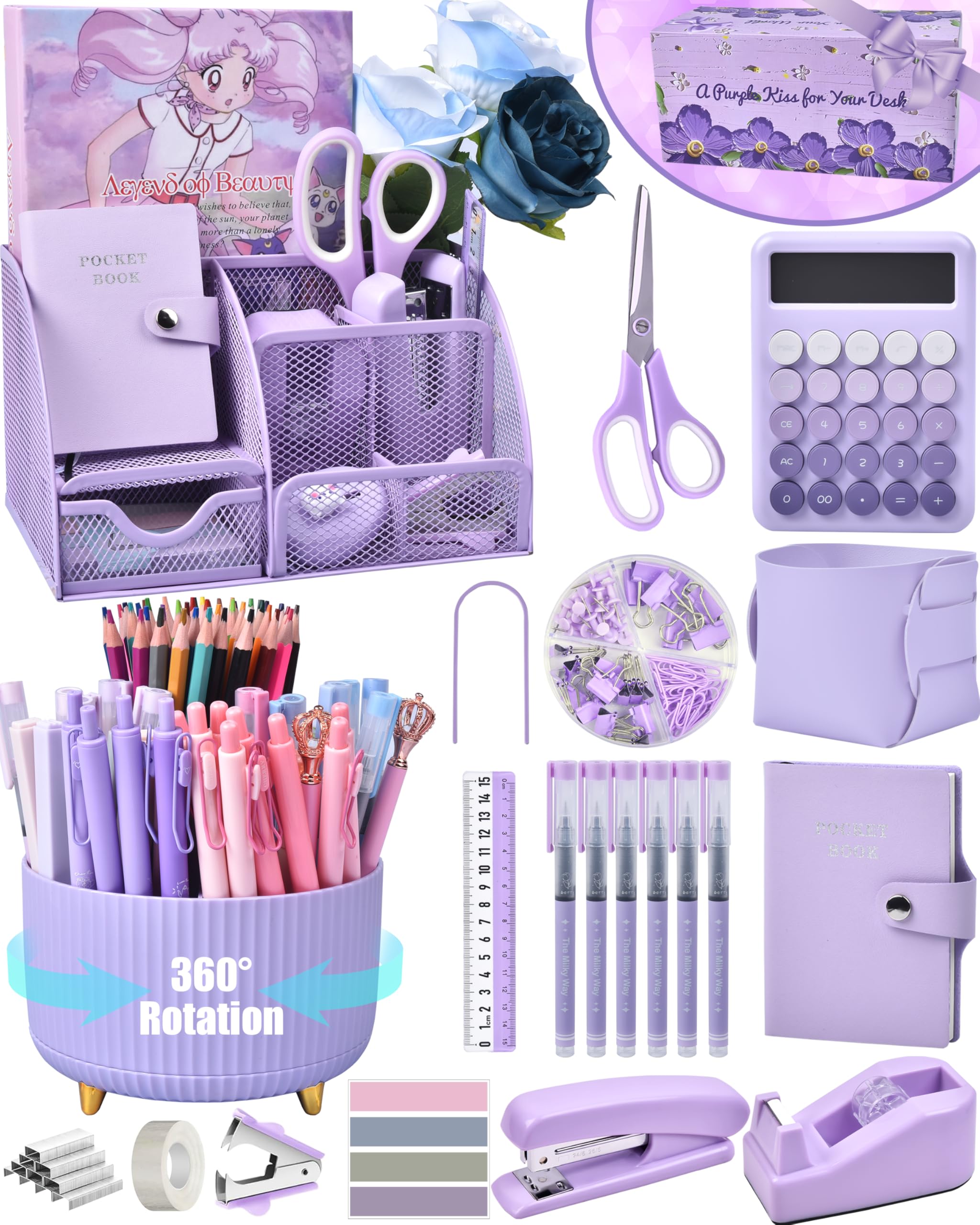 Organizadores de escritorio y accesorios morados con organizador de escritorio de malla y soporte giratorio para bolígrafos de 360