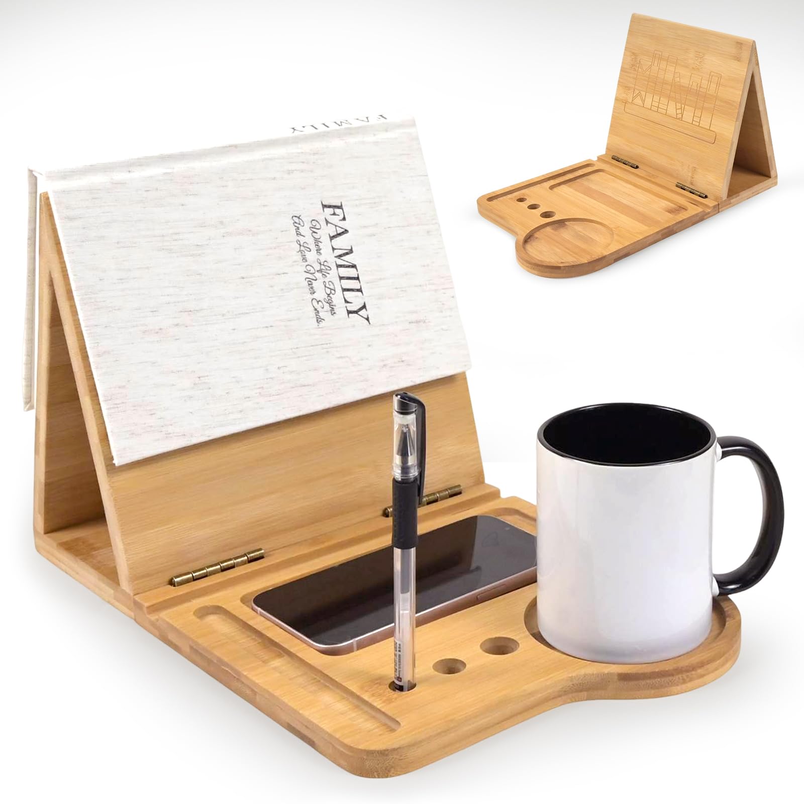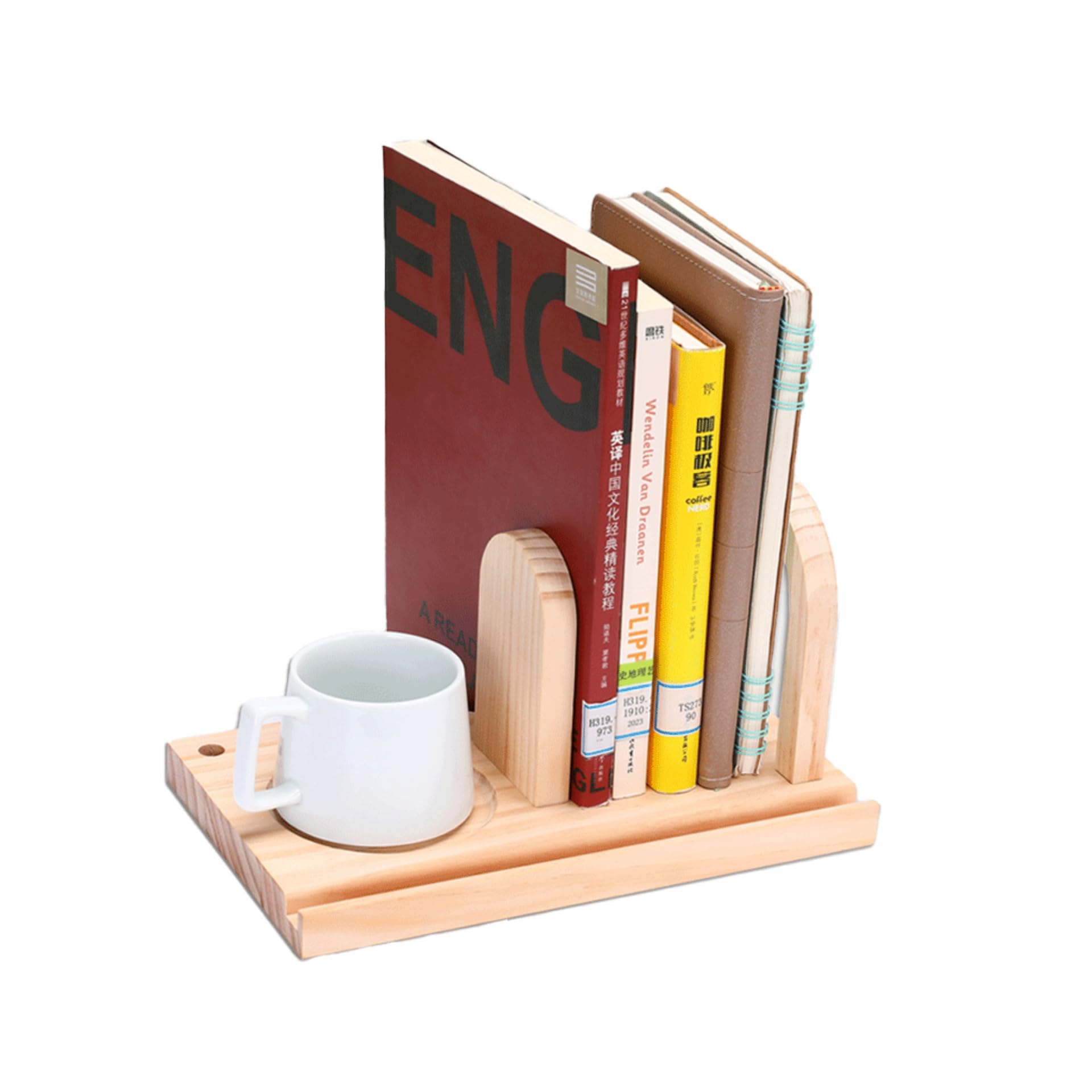 MEGREZ Soporte para libros de madera con soporte para tazas, extremos de libro de madera maciza para sostener libros, mini soporte