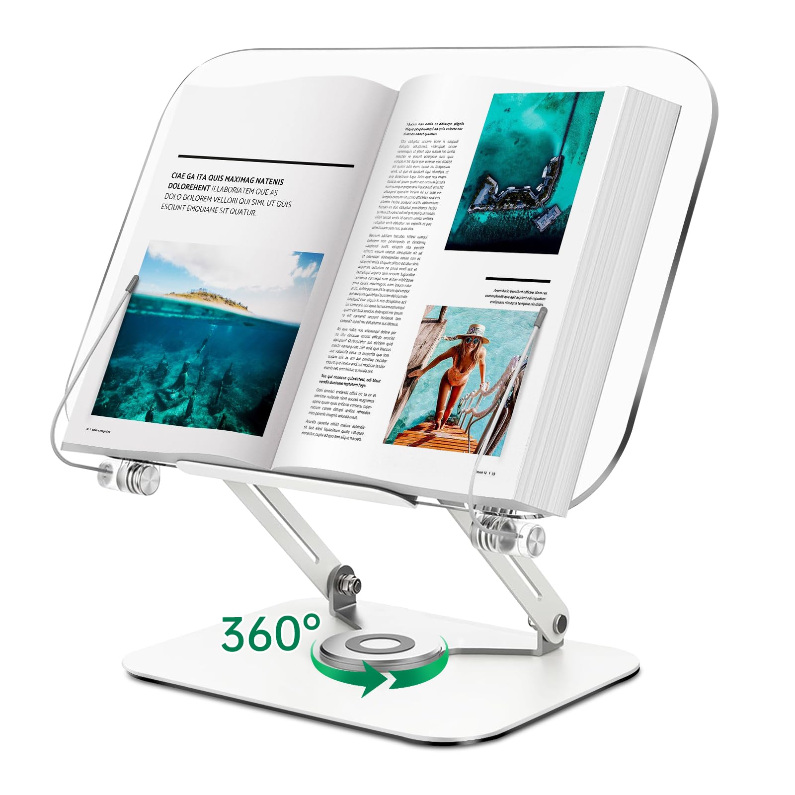 Soporte para libros de acrílico transparente para lectura, soporte ajustable para libros con base giratoria de 360° y clips de pág