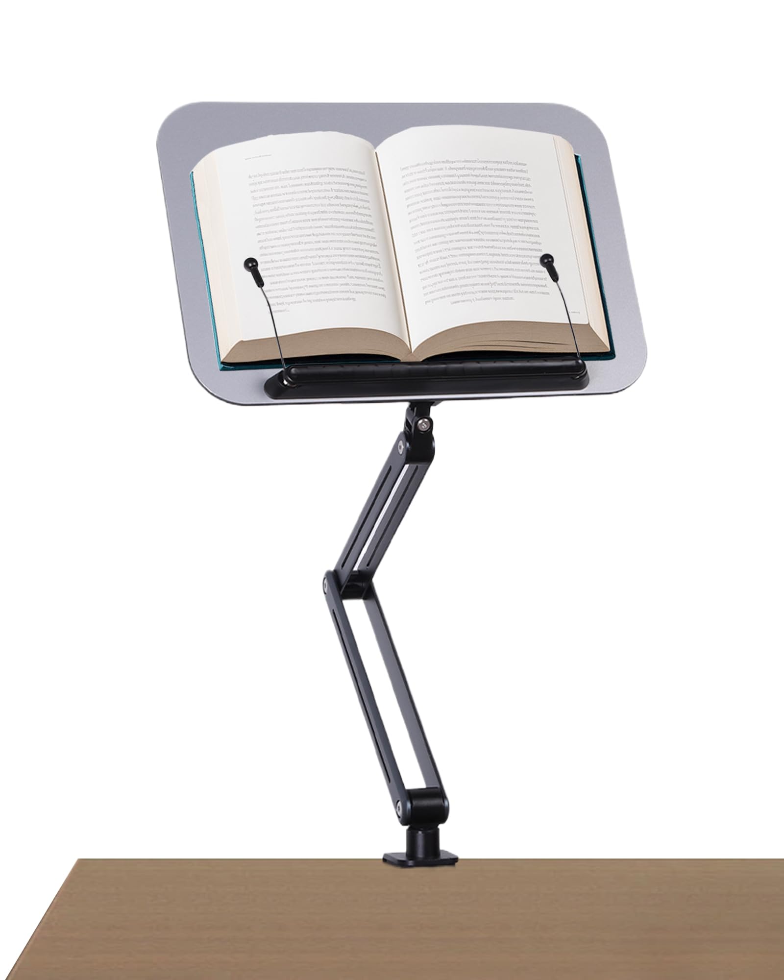 Soporte para libros con abrazadera de escritorio, soporte de aluminio para libros de altura y ángulo ajustables, soporte para libr