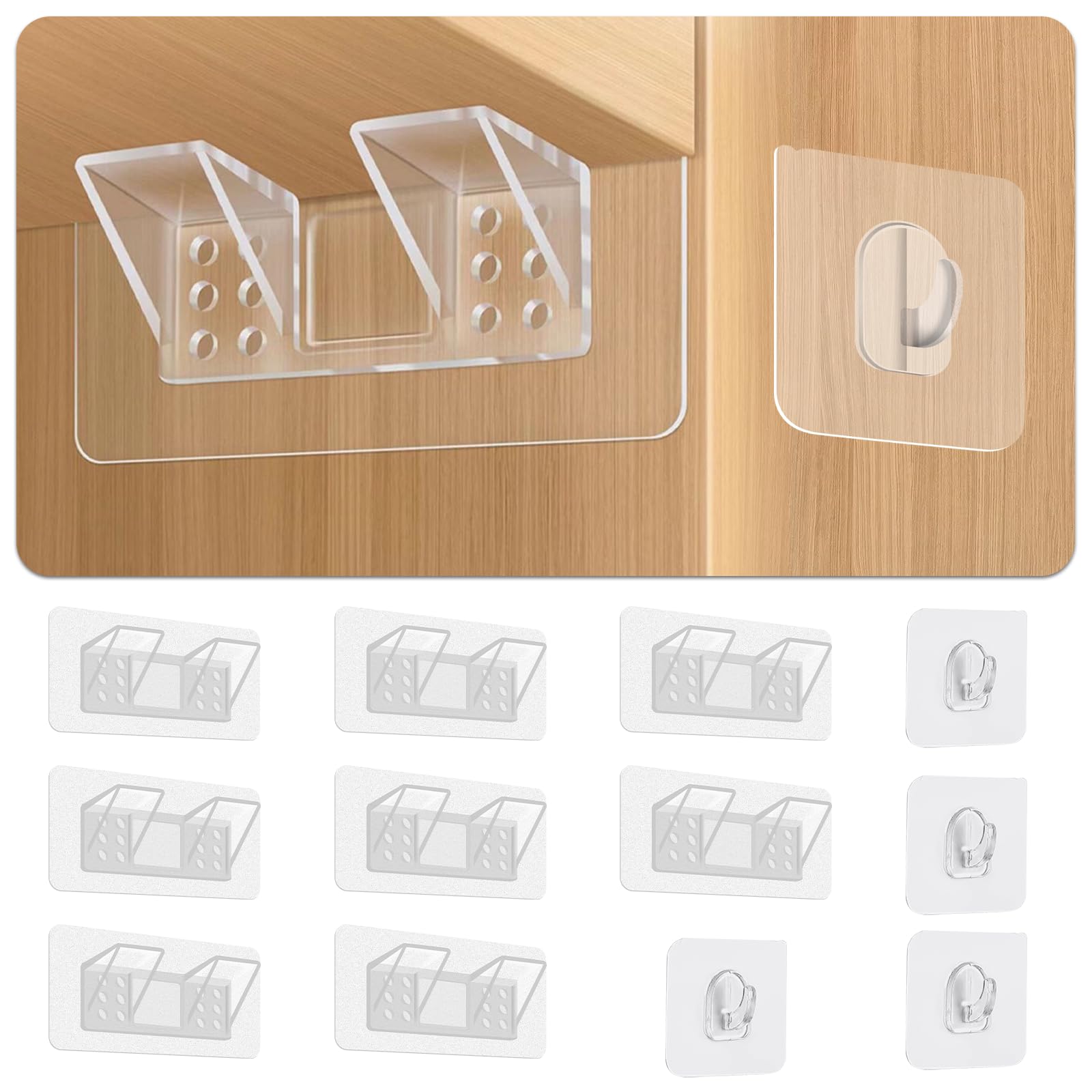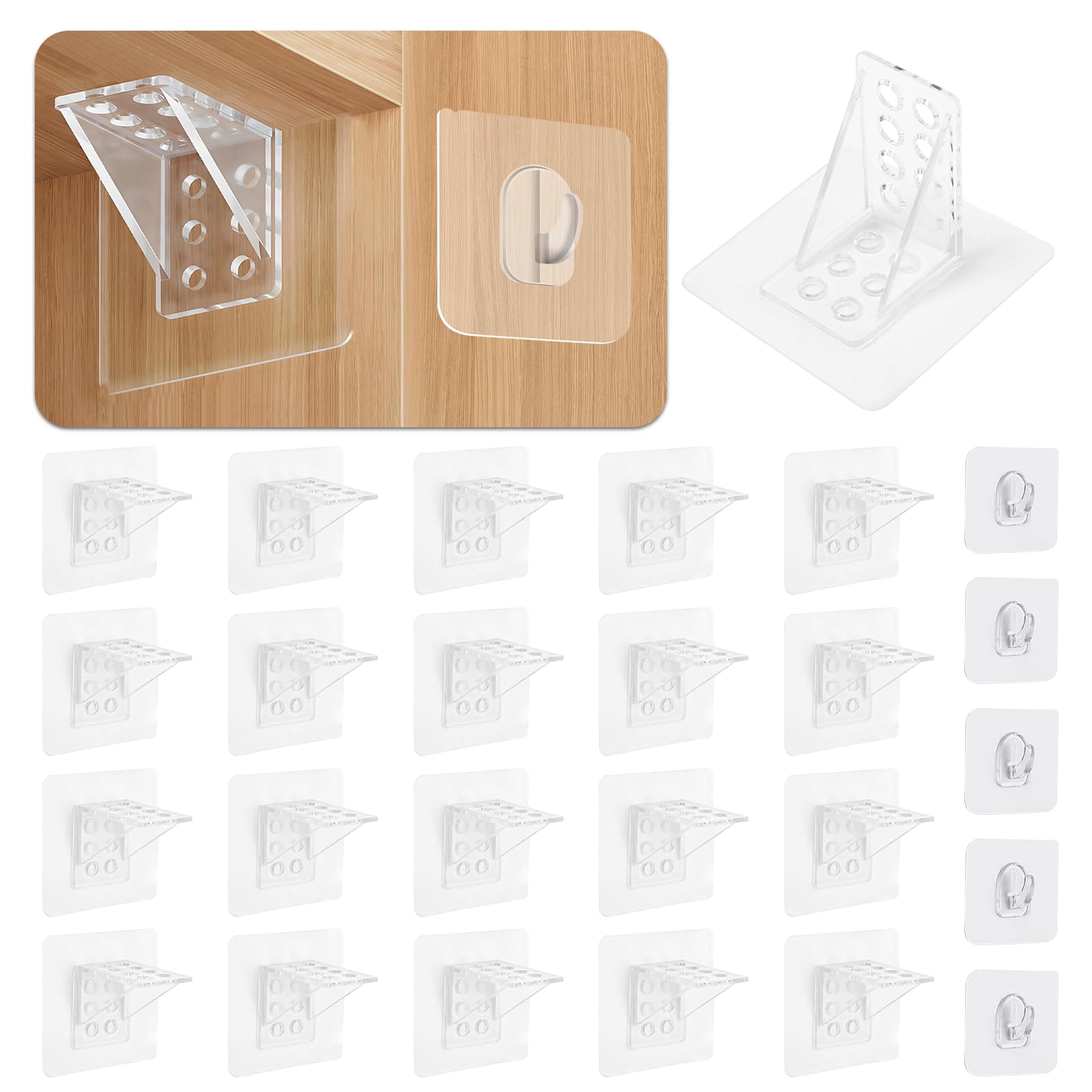 20-Pack Clear Adhesive Shelf Supports & 5 Heavy-Duty Hooks, 2.8×2.8 Inch PVC Shelf Brackets & 2.4×2.4 Inch Sticky Hooks for Cabine