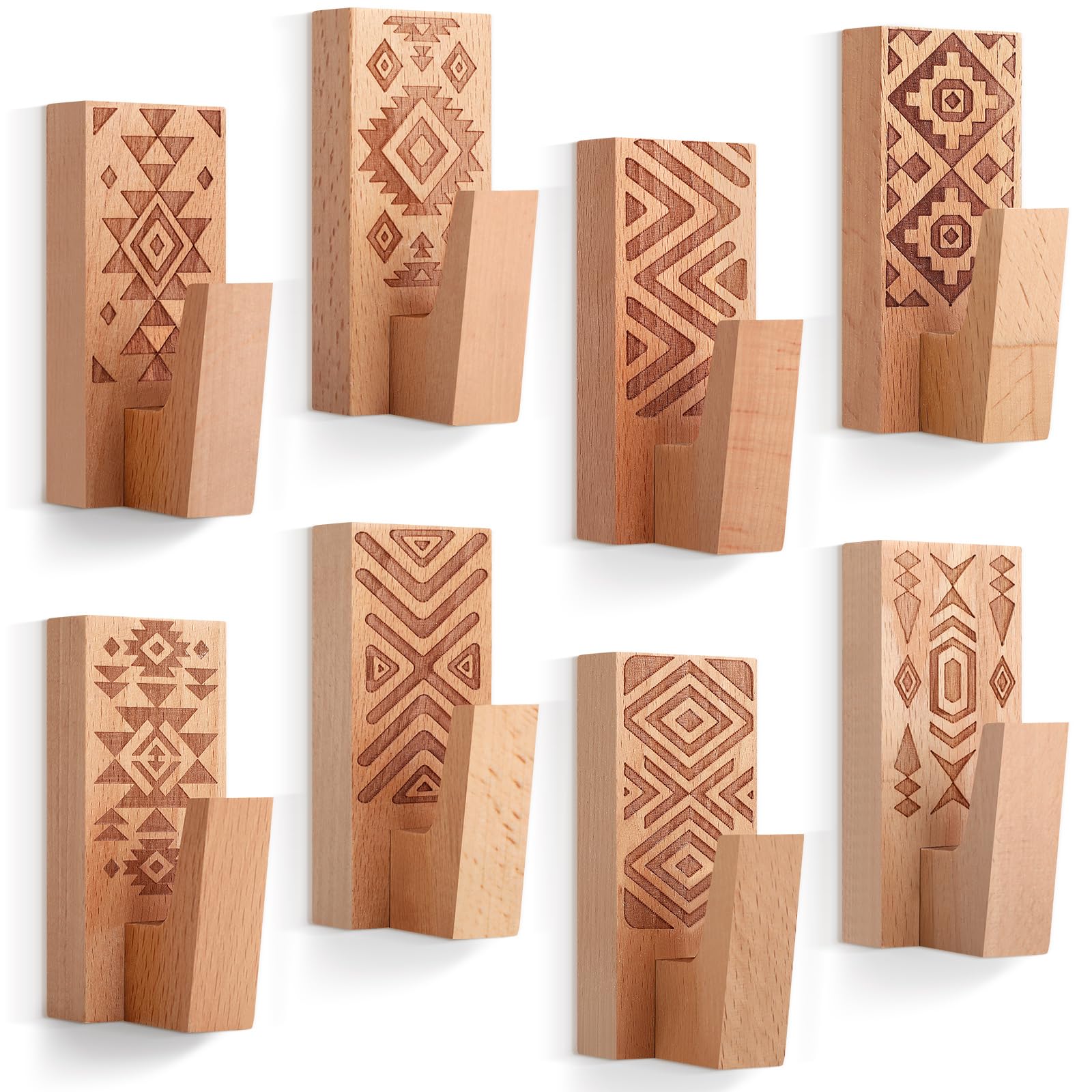 Amyhill Paquete de 8 ganchos de pared adhesivos de madera bohemios, ganchos de madera bohemios para colgar sombrero, abrigo, chaqu