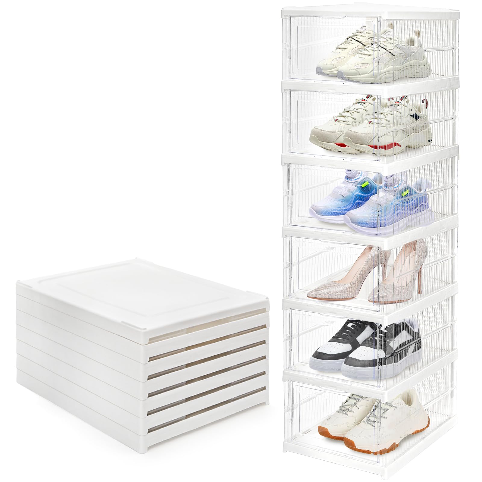 Hedume 6 Pack Clear Shoe Boxes Stackable, Drop Front Shoe Storage Box, No Assembly Plastic Shoe Organizer Storage Bin with Door, F