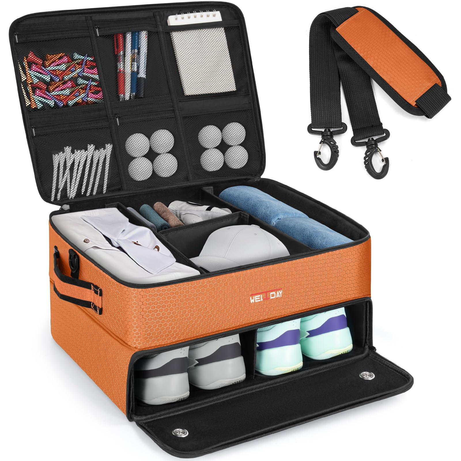 Golf Trunk Organizer, 2 Layer Golf Storage Case with Separate Ventilated Compartment for 2 Pair Shoes, for Balls, Tees, Clothes, G